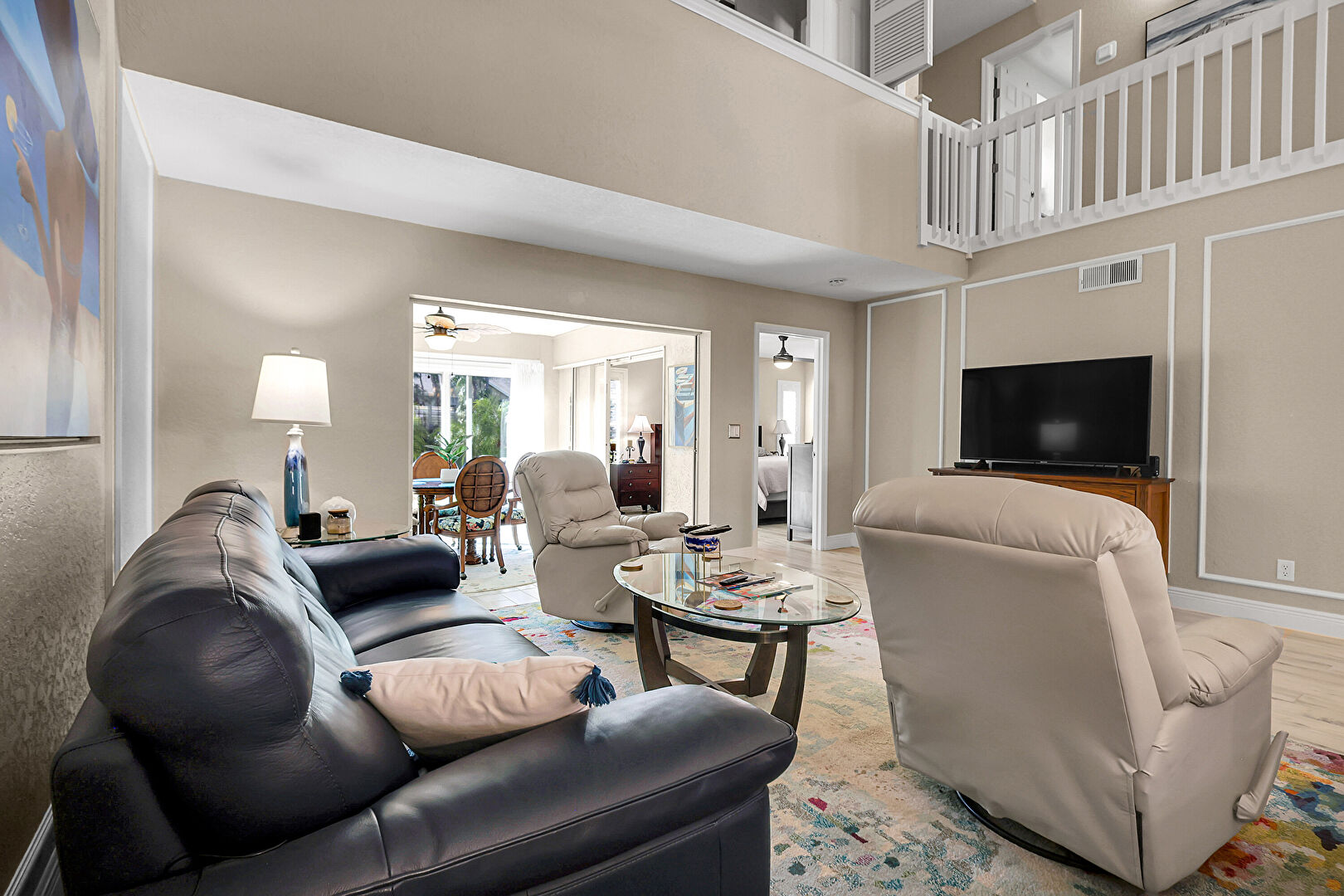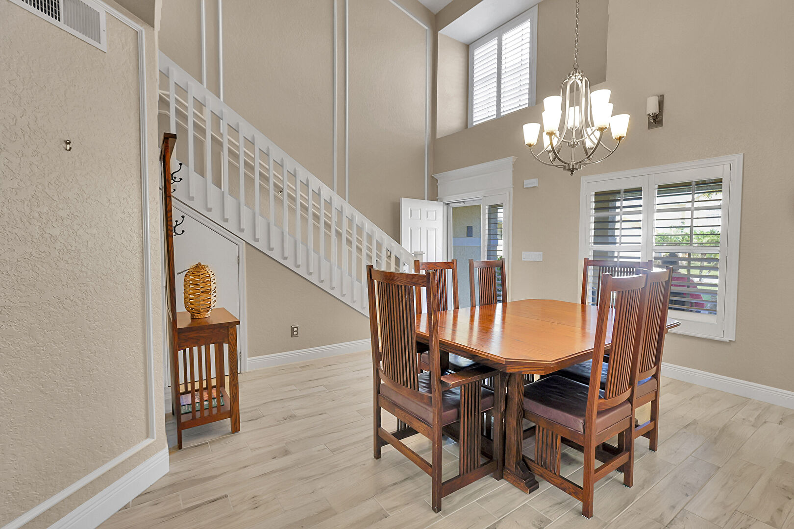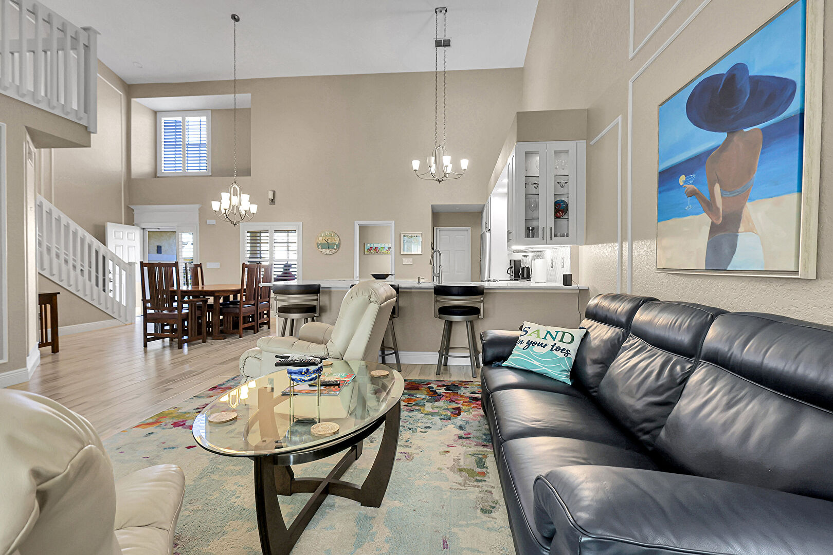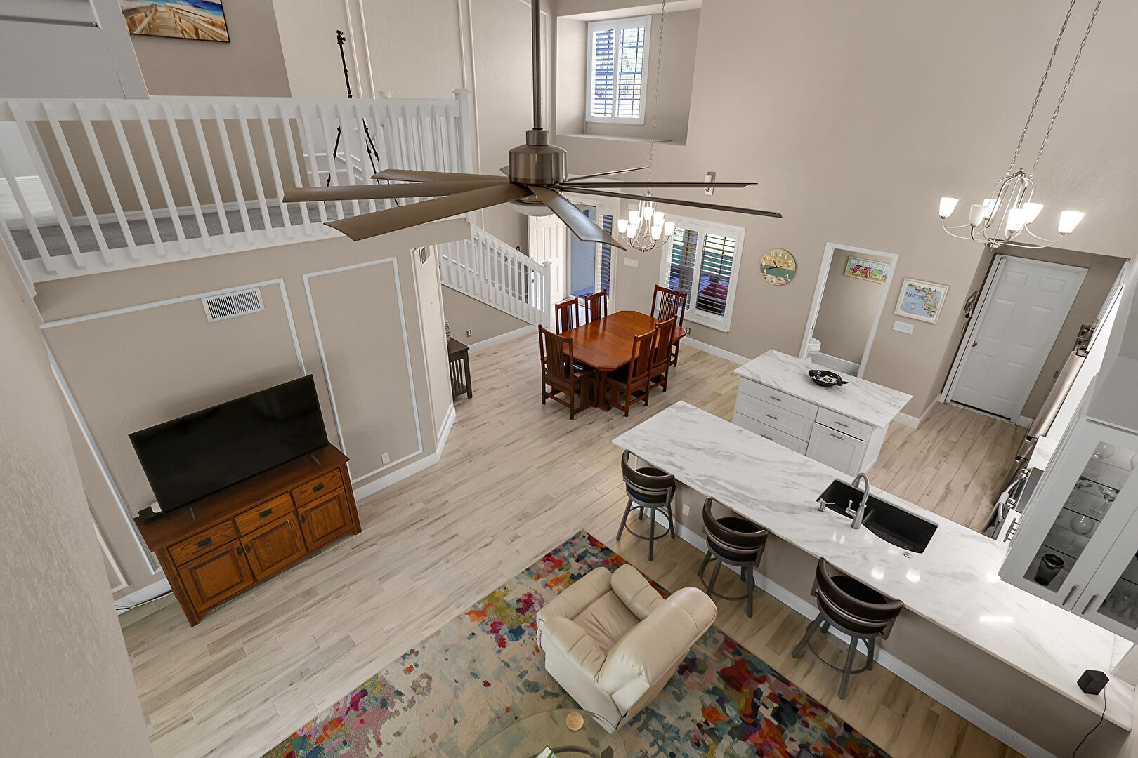 Baseboards Wall, Ceiling Fan, Drywall, High Ceiling, L Shaped Kitchen, Natural Light, Notable Chandelier, Stairs, Textured Wall, Vaulted Ceiling, Vent, Wood Finish Floor, Baseboards Wall, Drywall, Vent, Wood Finish Floor