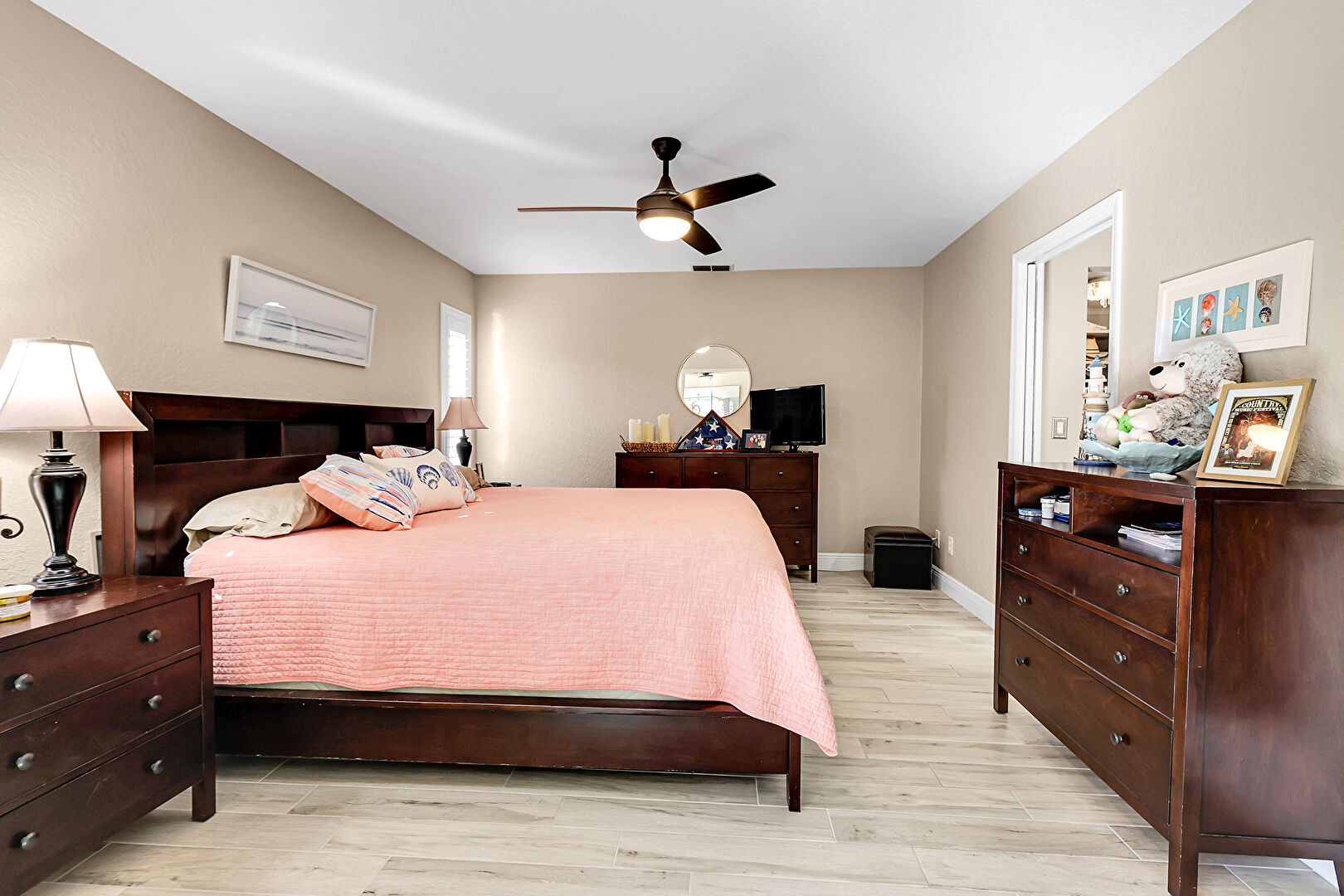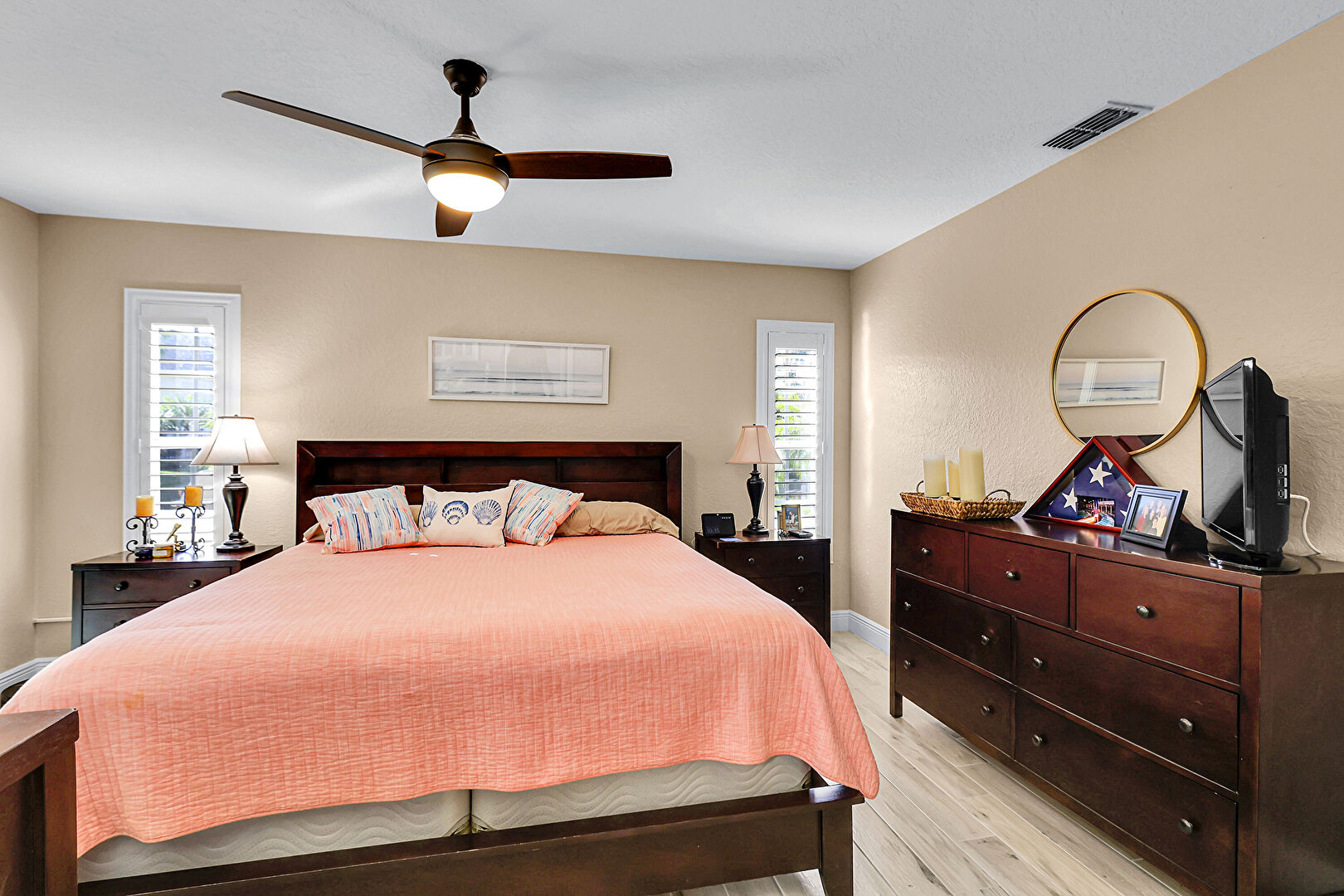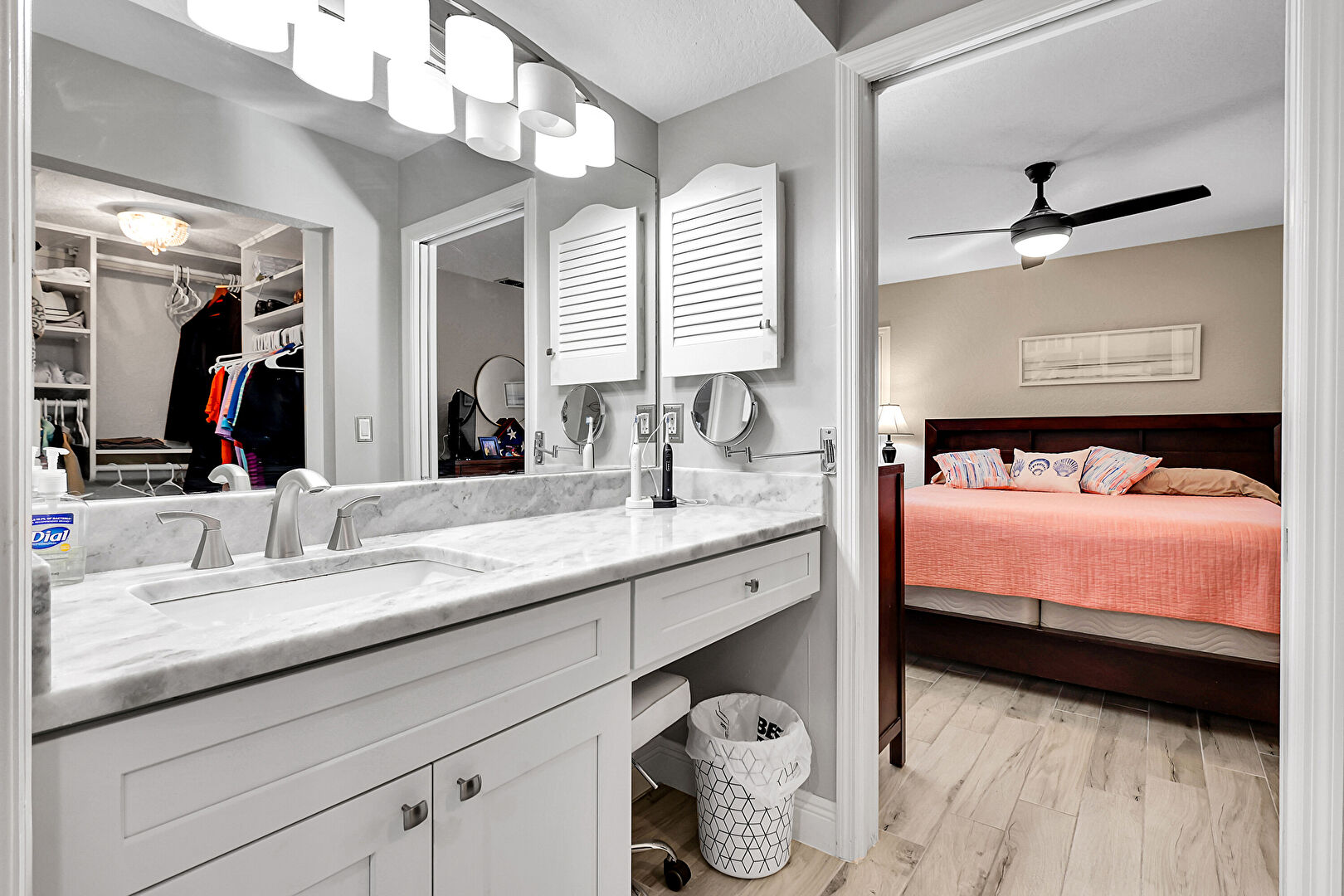 Baseboards Wall, Ceiling Fan, Drywall, Ensuite Bathroom, Full Bathroom, Recessed Lighting, Textured Ceiling, Textured Wall, Tile Wall, Vanity, Wainscot Wall, Walk In Closet, Wood Finish Floor, Tile Wall, Vent, Walk In Closet, Wood Finish Floor