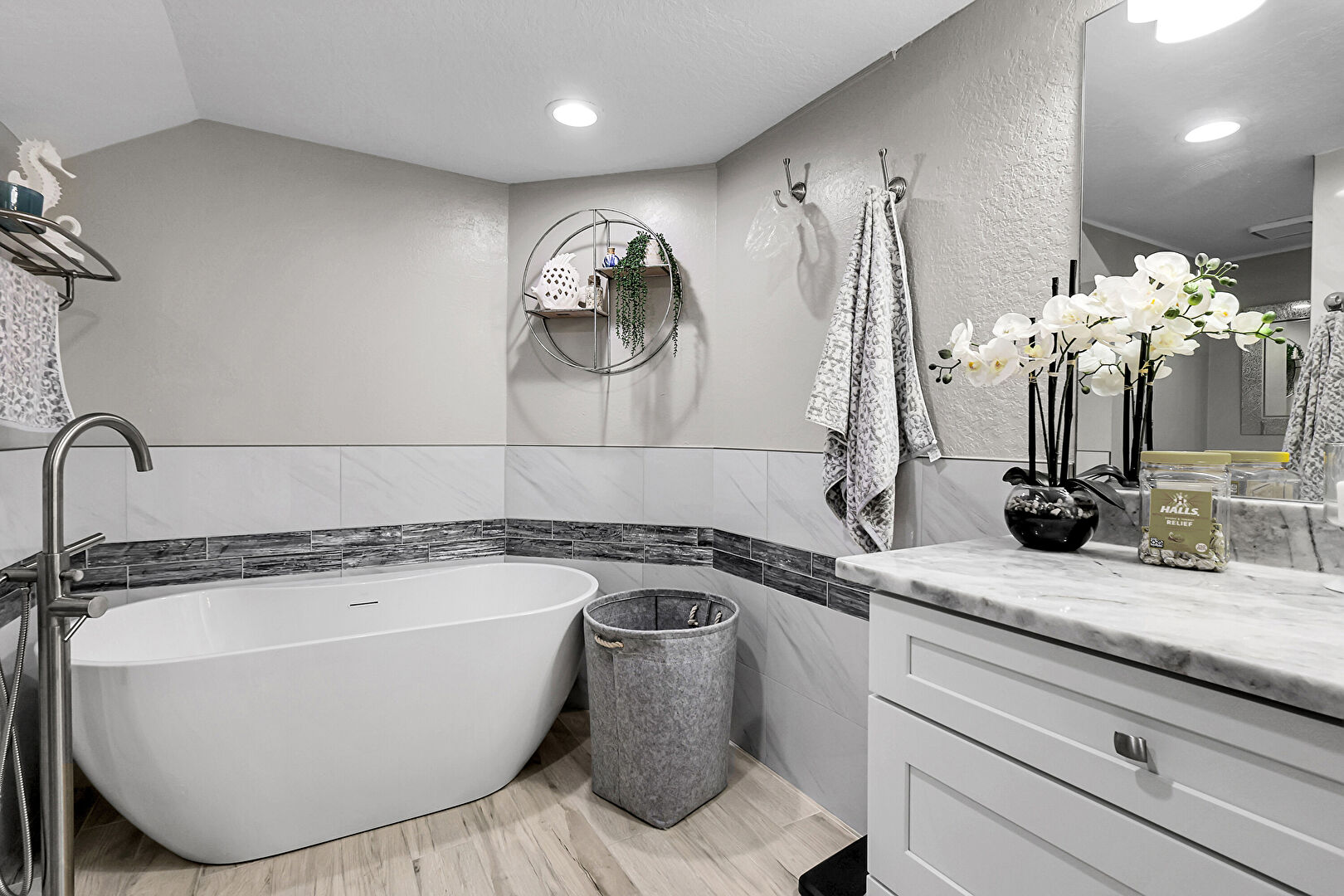 Baseboards Wall, Drywall, Full Bathroom, Half Bathroom, Vanity, Wood Finish Floor, Baseboards Wall, Wood Finish Floor