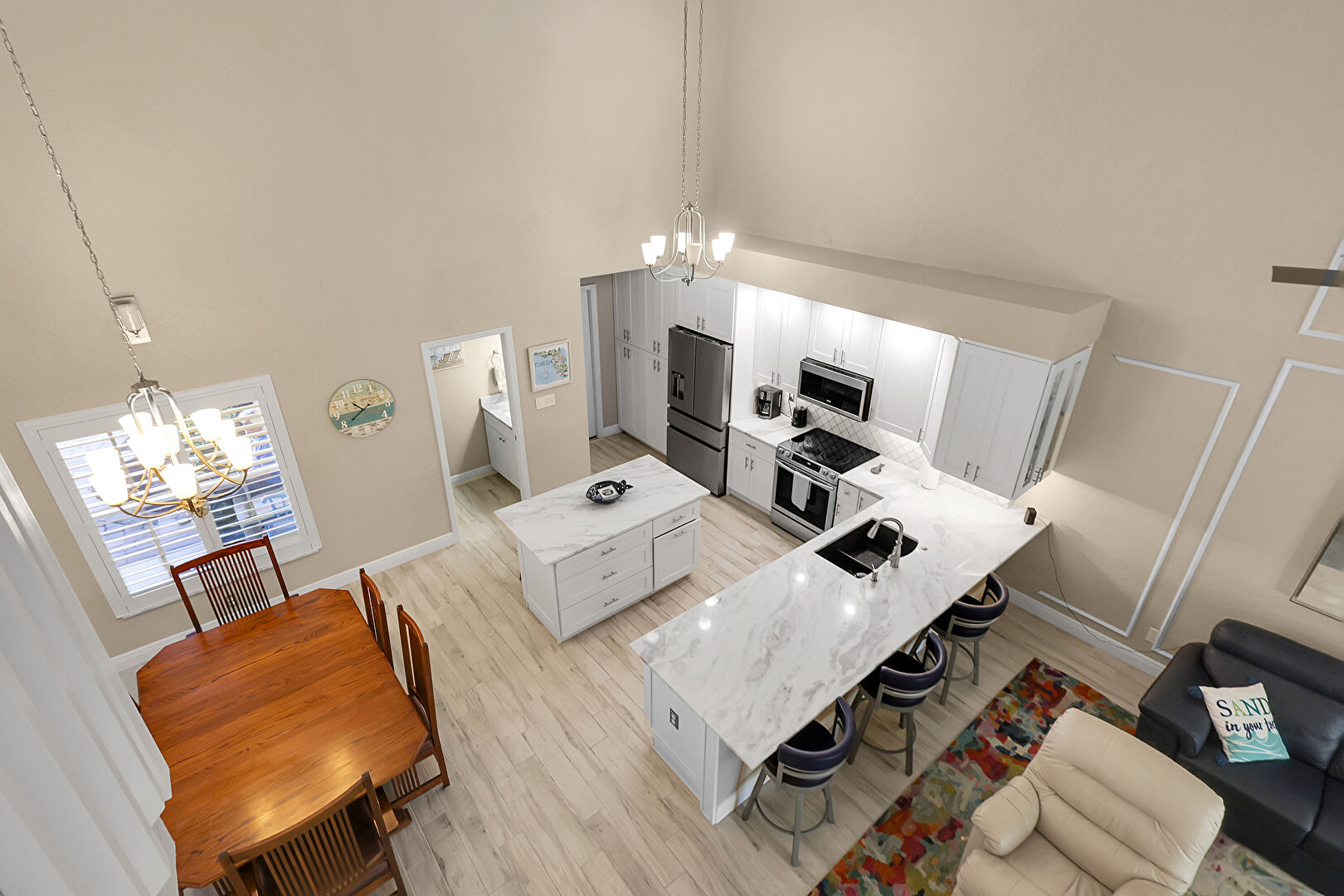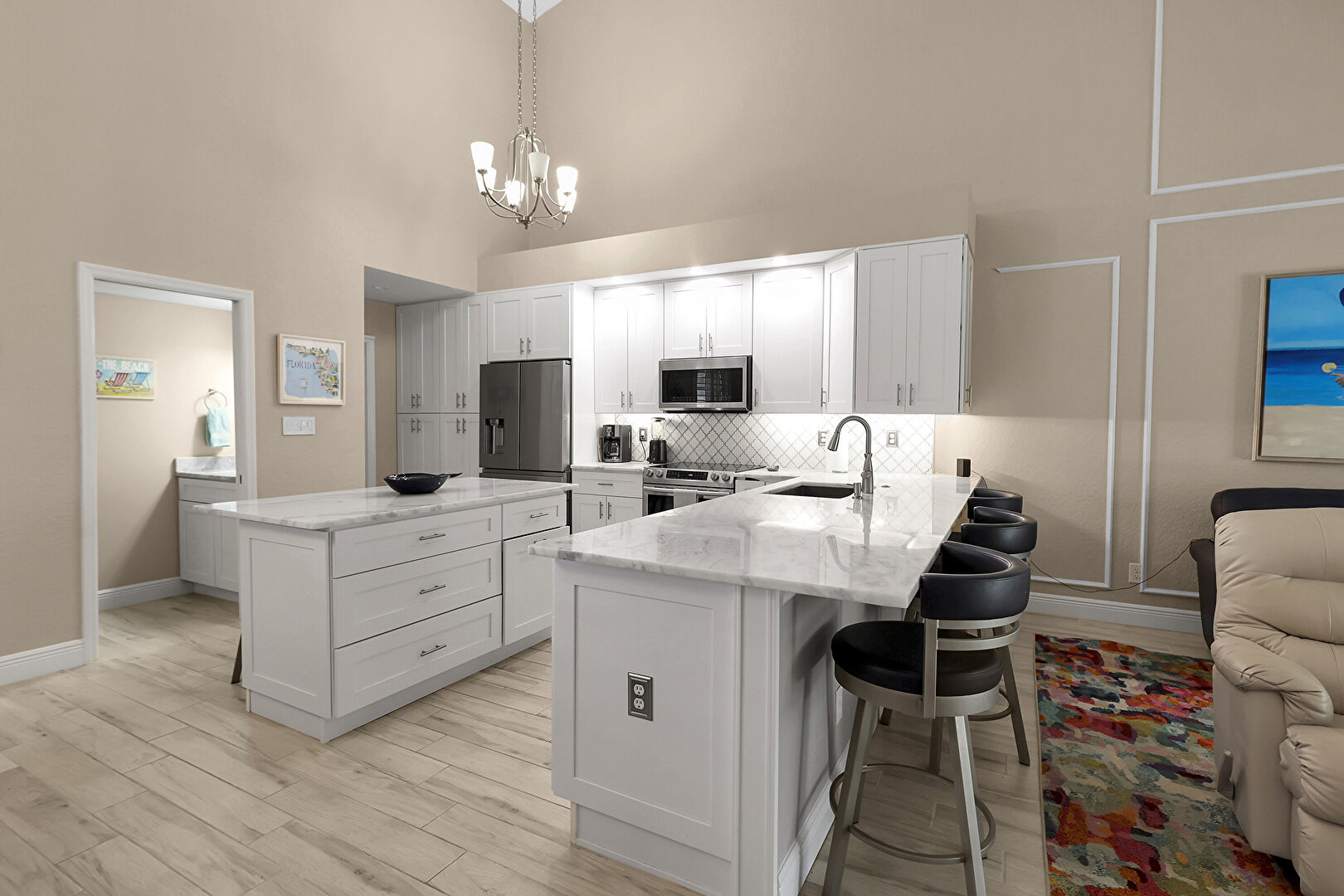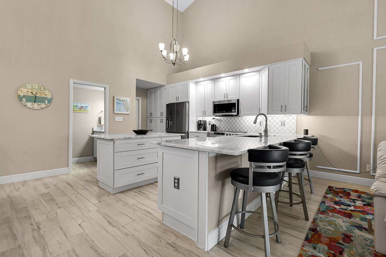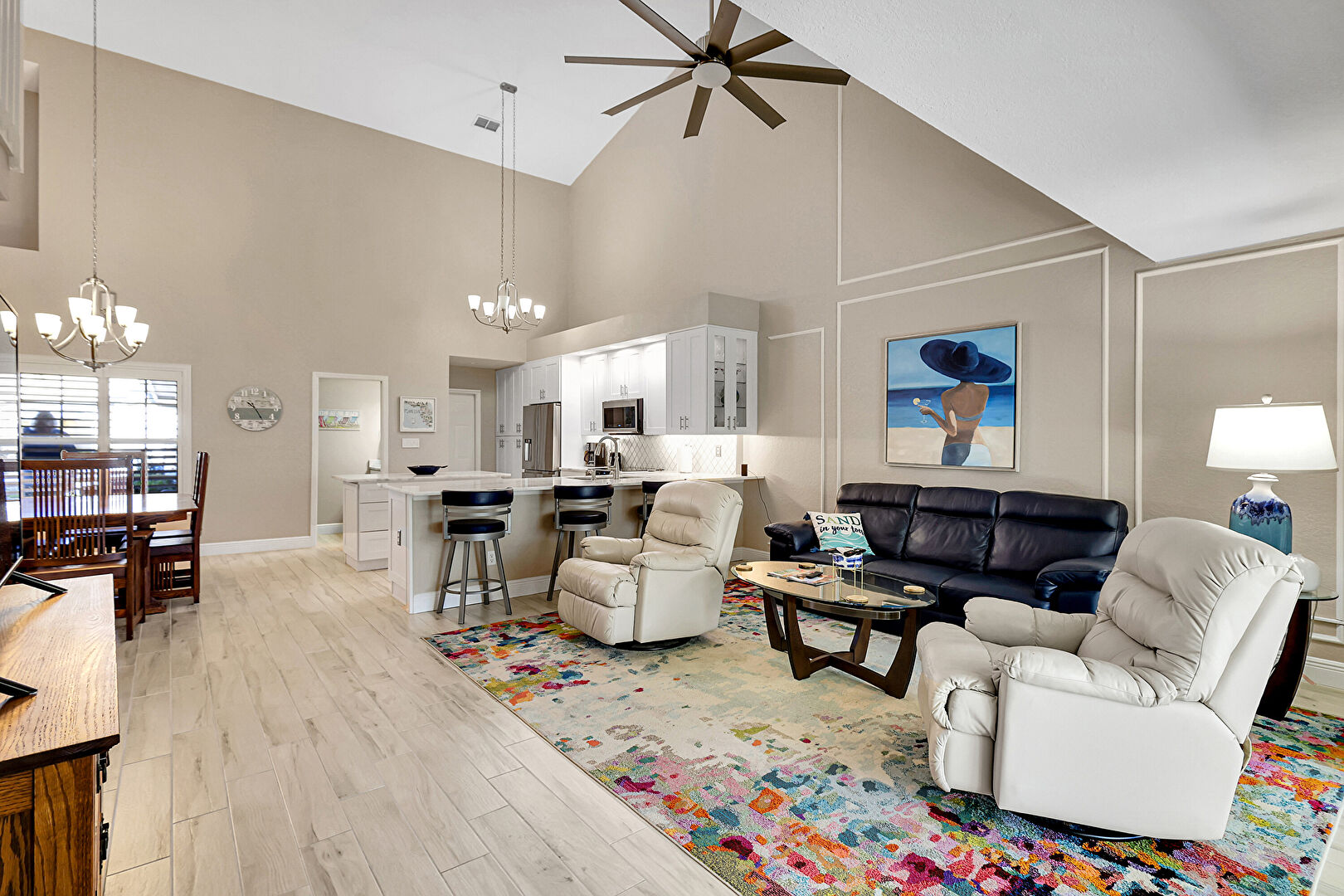 Baseboards Wall, Ceiling Fan, Drywall, High Ceiling, Kitchen Bar, Kitchen Island, Kitchen Peninsula, L Shaped Kitchen, Natural Light, Notable Chandelier, Opens To Living Area, Pendant Lighting, Recessed Lighting, Shaker Cabinets, Stone Countertops, Vaulted Ceiling, Vent, Wood Finish Floor, Ceiling Fan, Drywall, High Ceiling, Kitchen Bar, Natural Light, Notable Chandelier, Pendant Lighting, Shaker Cabinets, Stone Countertops, Wood Finish Floor