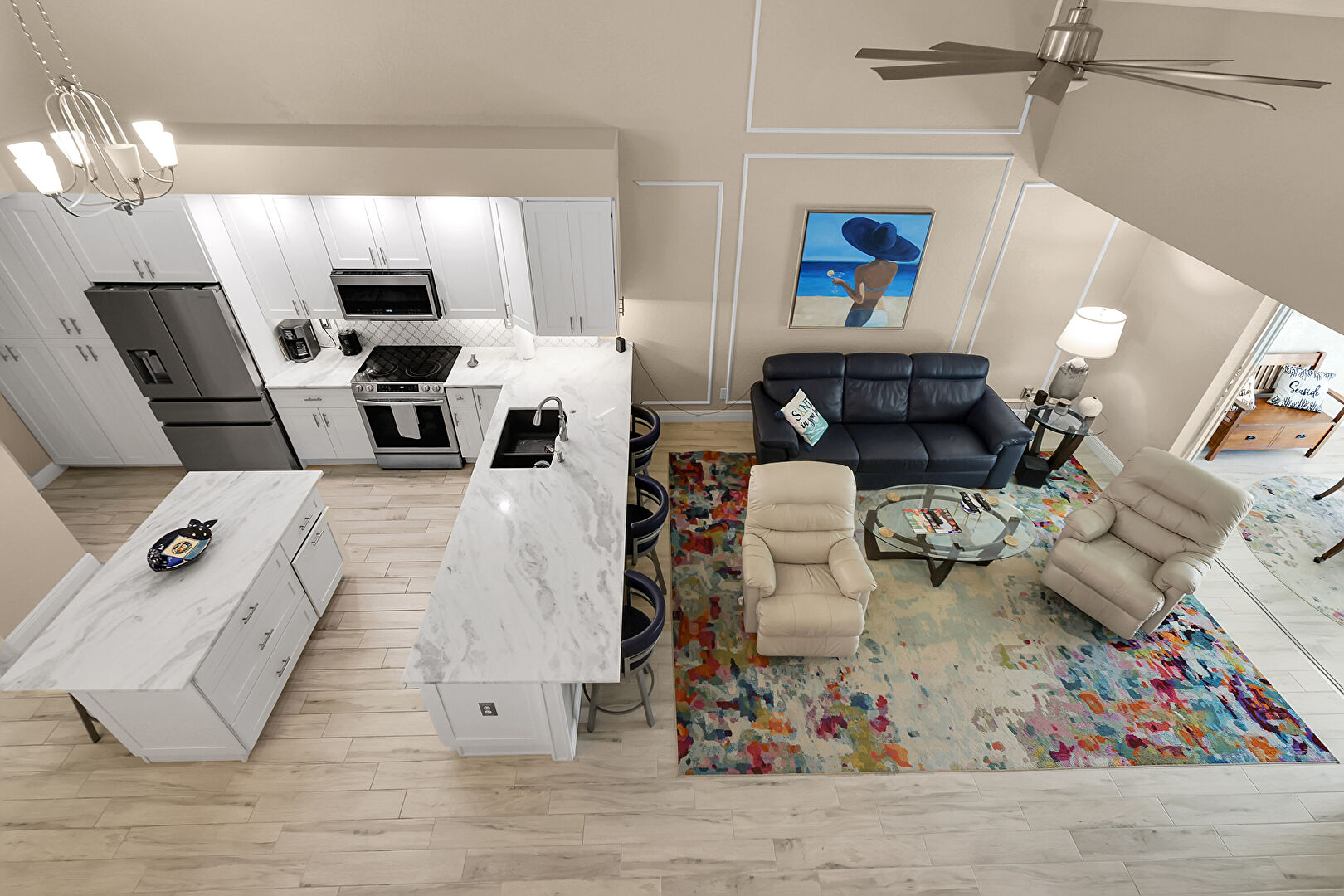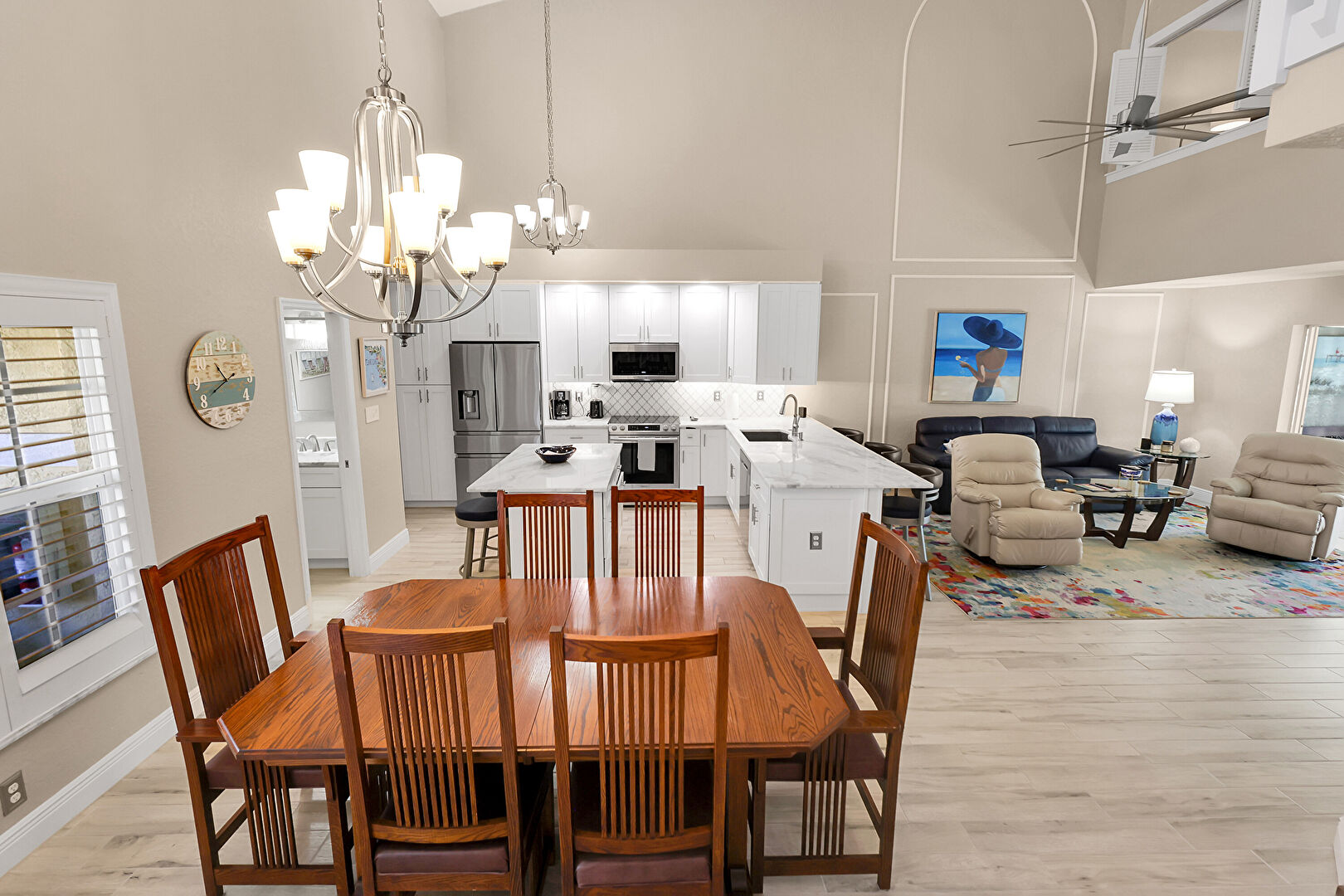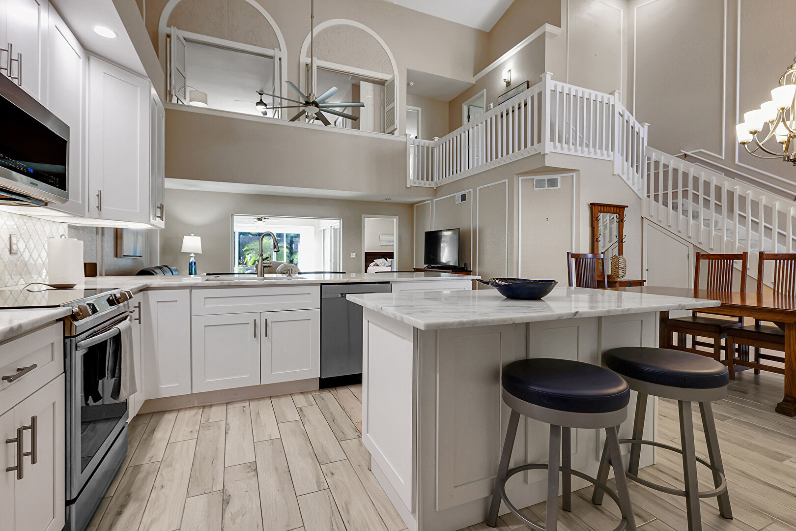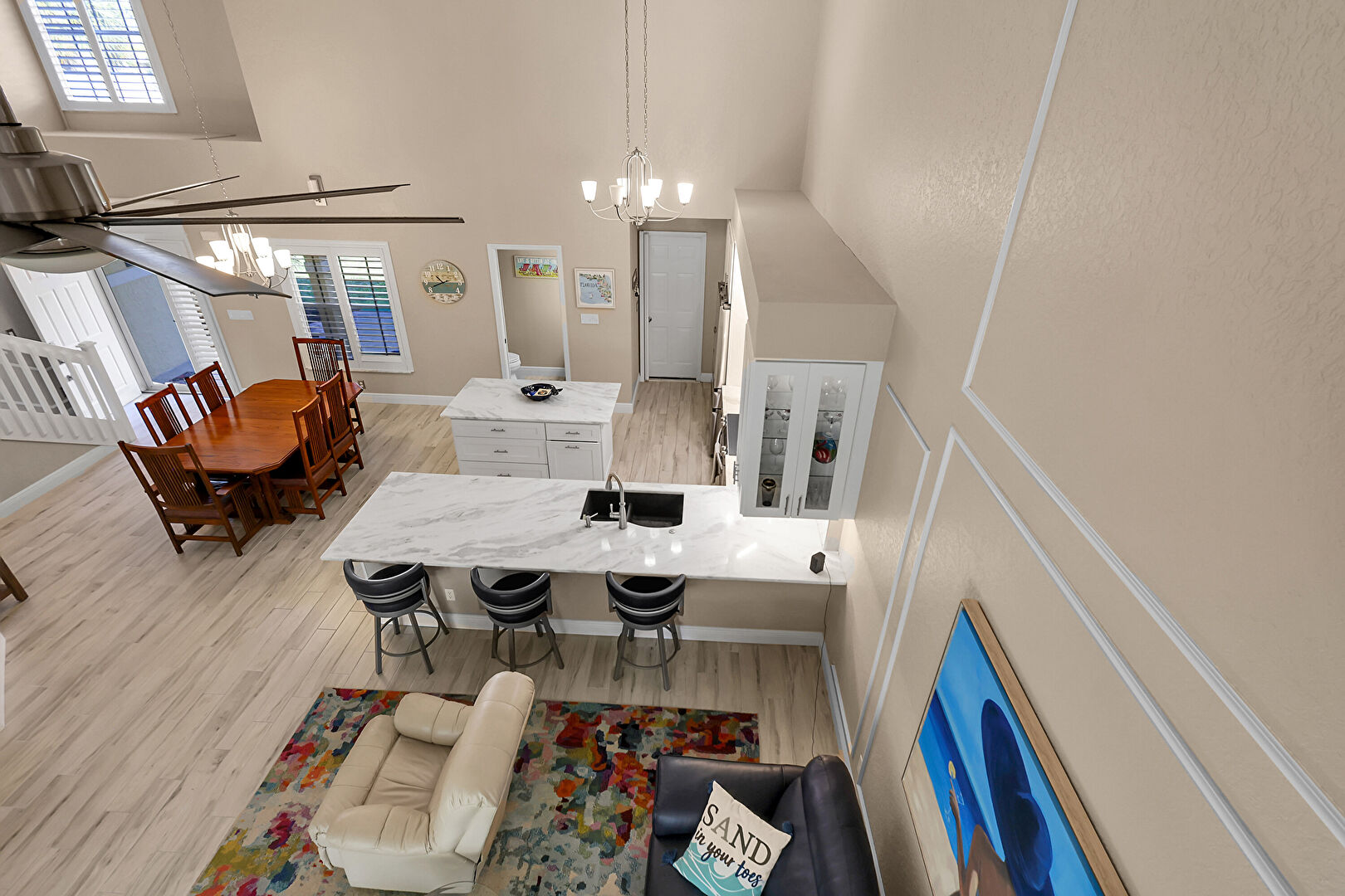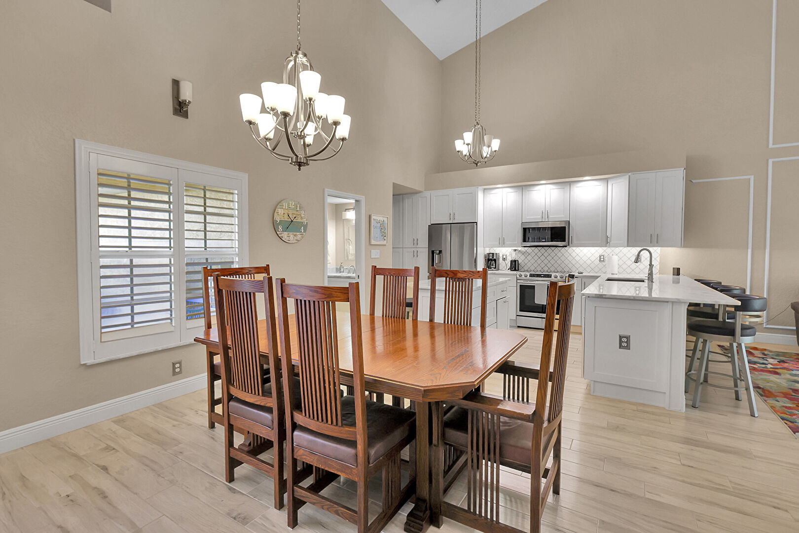 Baseboards Wall, Ceiling Fan, Drywall, High Ceiling, Kitchen Bar, Kitchen Island, Kitchen Peninsula, L Shaped Kitchen, Natural Light, Notable Chandelier, Opens To Living Area, Pendant Lighting, Recessed Lighting, Shaker Cabinets, Stone Countertops, Vaulted Ceiling, Vent, Wood Finish Floor, Ceiling Fan, Drywall, High Ceiling, Kitchen Bar, Natural Light, Notable Chandelier, Pendant Lighting, Shaker Cabinets, Stone Countertops, Wood Finish Floor