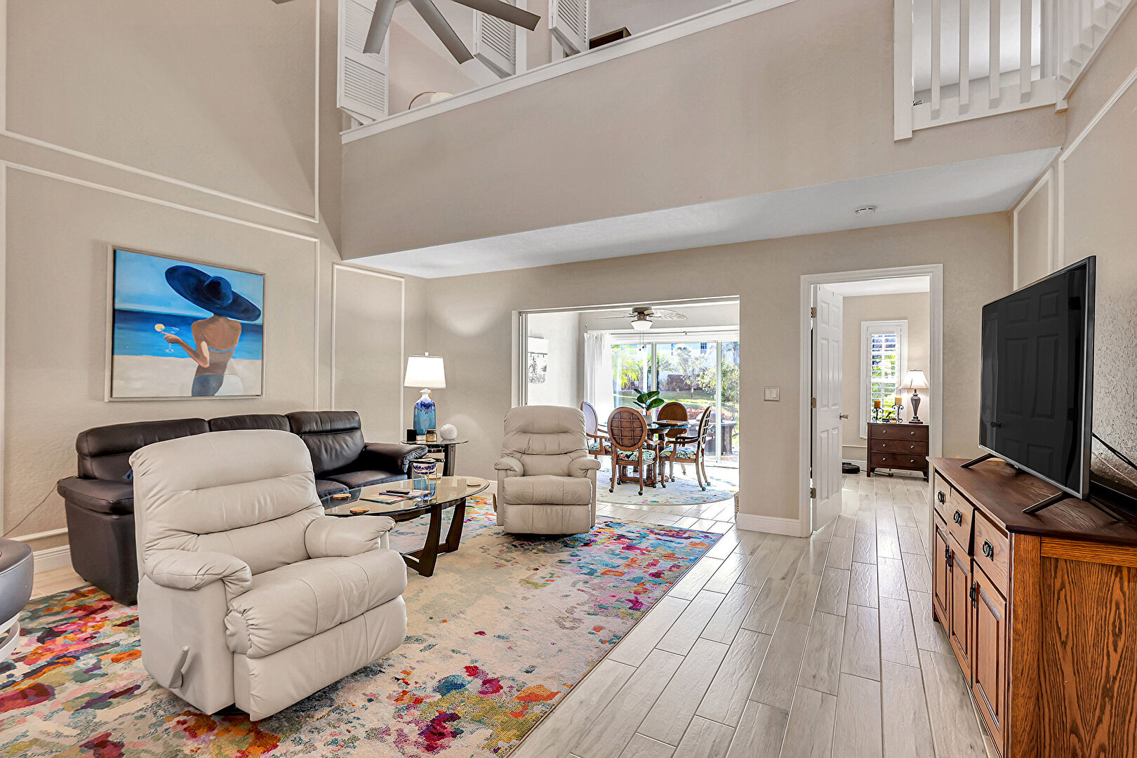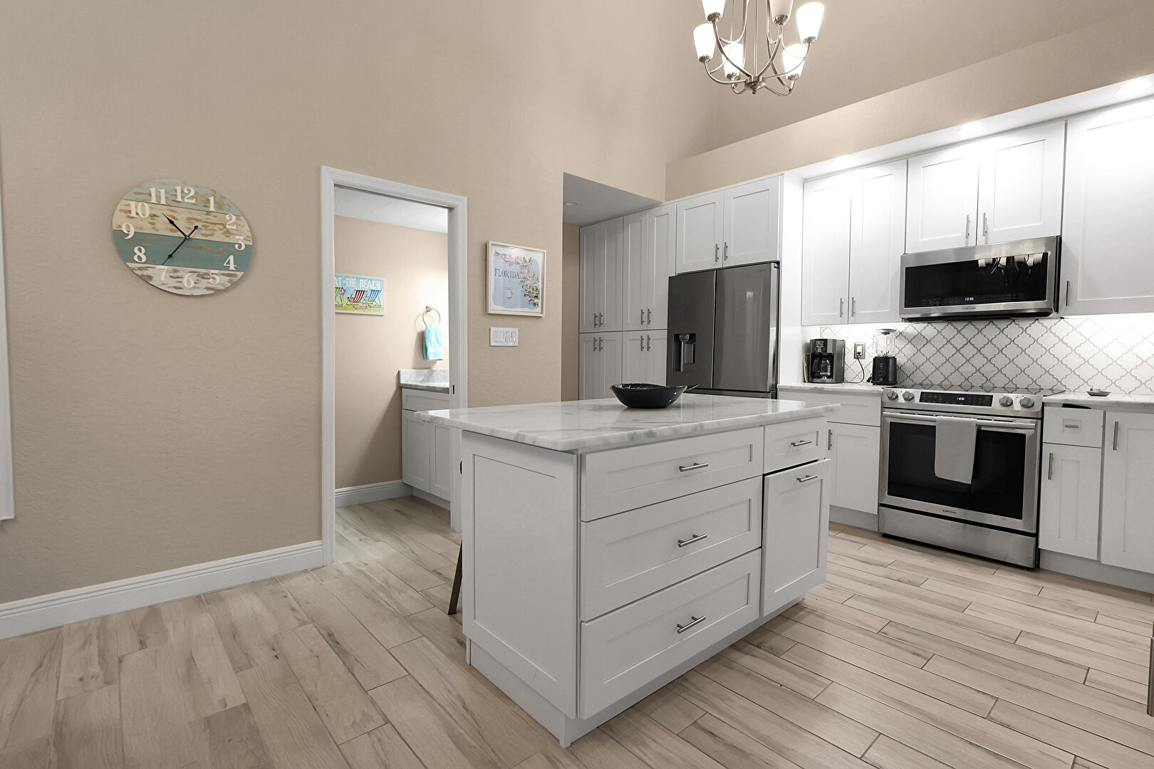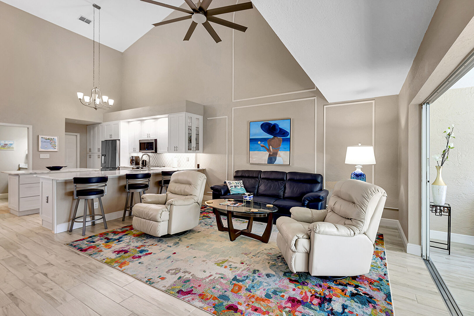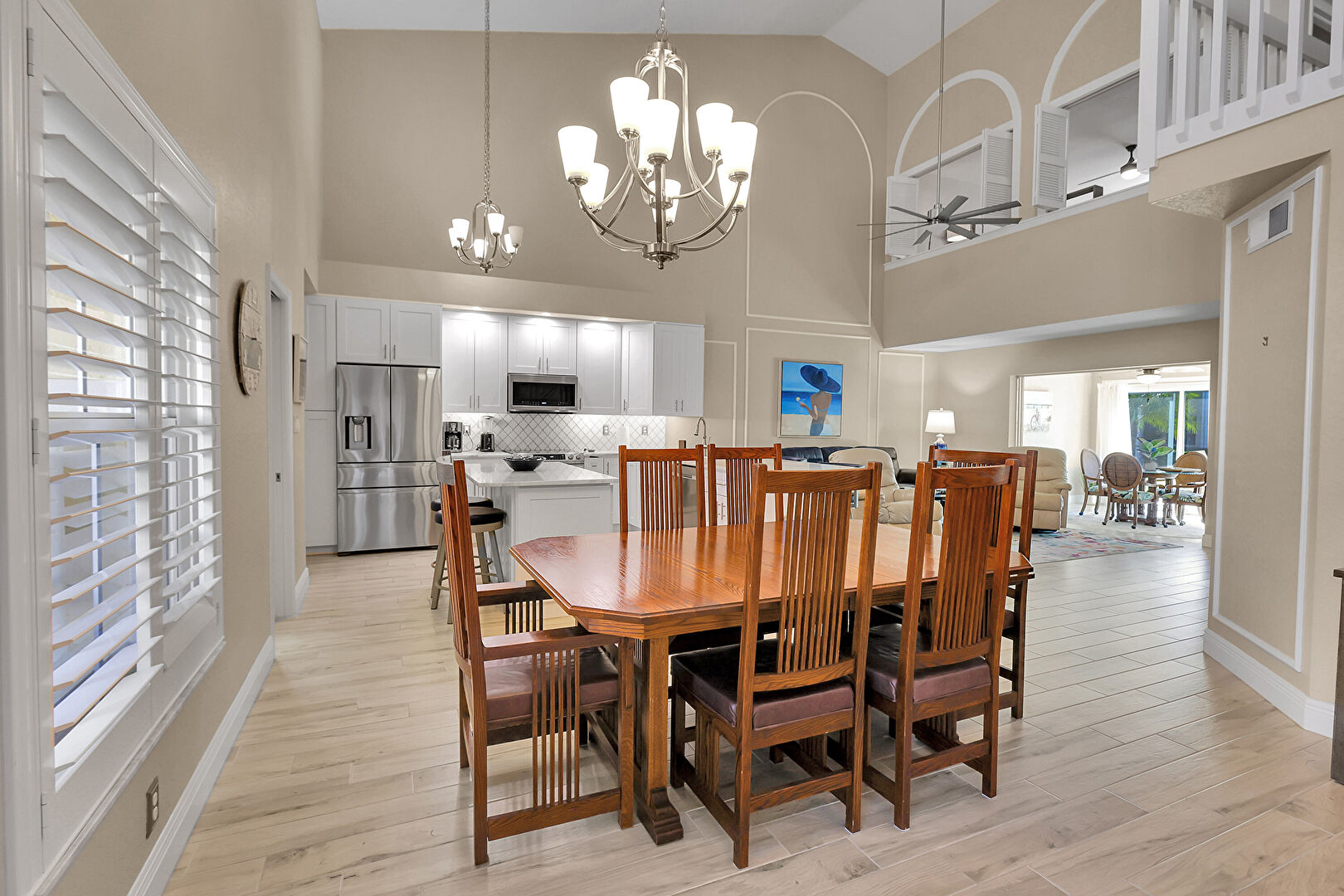 Baseboards Wall, Ceiling Fan, Drywall, High Ceiling, Kitchen Bar, Kitchen Island, Kitchen Peninsula, L Shaped Kitchen, Natural Light, Notable Chandelier, Opens To Living Area, Pendant Lighting, Recessed Lighting, Shaker Cabinets, Stone Countertops, Vaulted Ceiling, Vent, Wood Finish Floor, Ceiling Fan, Drywall, High Ceiling, Kitchen Bar, Natural Light, Notable Chandelier, Pendant Lighting, Shaker Cabinets, Stone Countertops, Wood Finish Floor