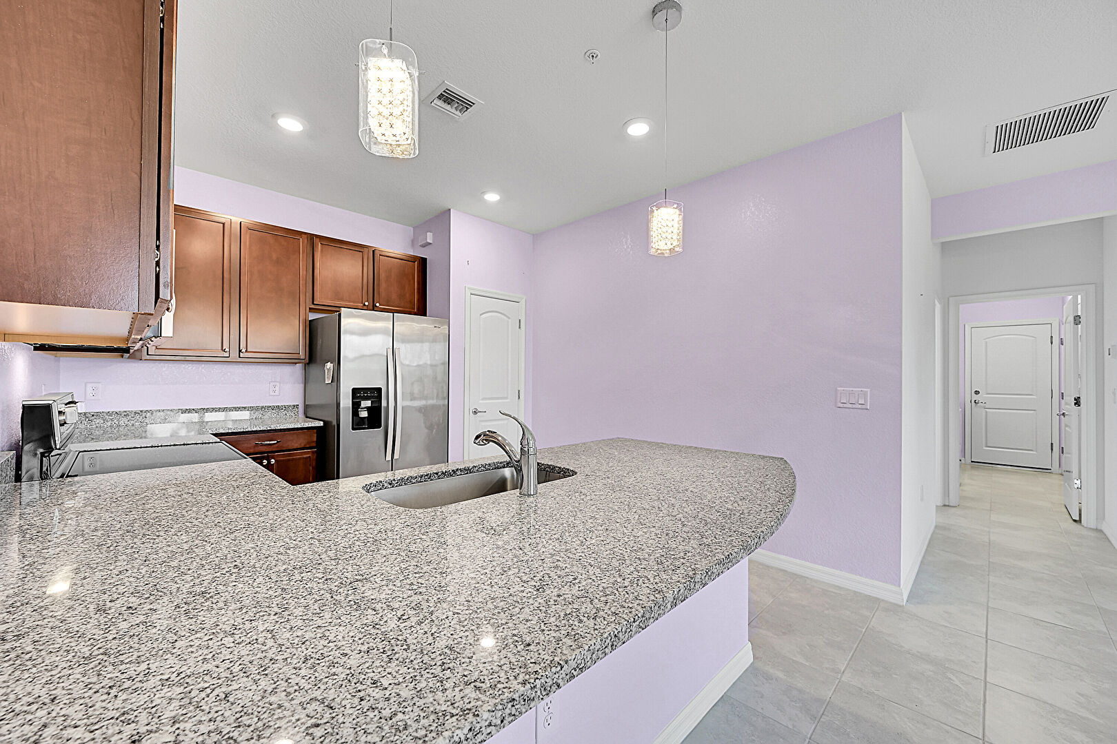 Baseboards Wall, Ceiling Fan, Dark Brown Cabinets, Drywall, Kitchen Bar, Kitchen Peninsula, Medium Brown Cabinets, Natural Light, Opens To Living Area, Pendant Lighting, Recessed Lighting, Shaker Cabinets, Stone Countertops, Textured Wall, Tile Floor, U Shaped Kitchen, Vent, Baseboards Wall, Drywall, Natural Light, Stone Countertops