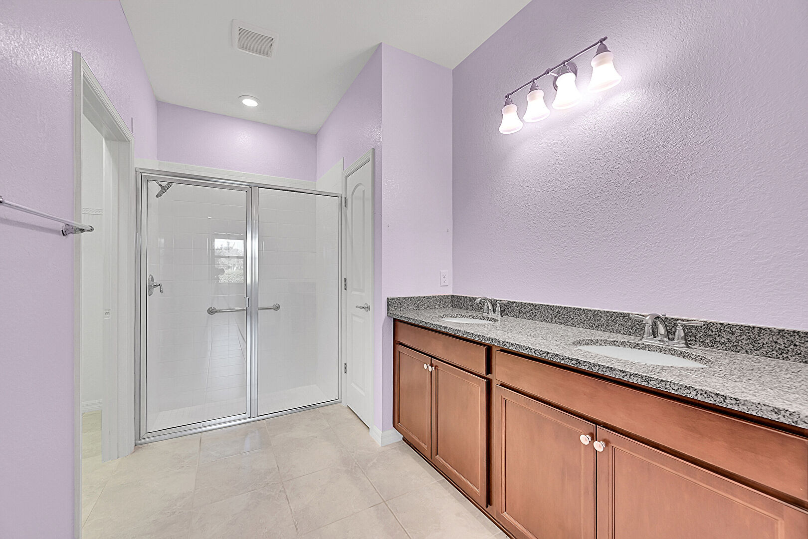 Double Vanity, Full Bathroom, Textured Wall, Tile Floor, Vent, Recessed Lighting