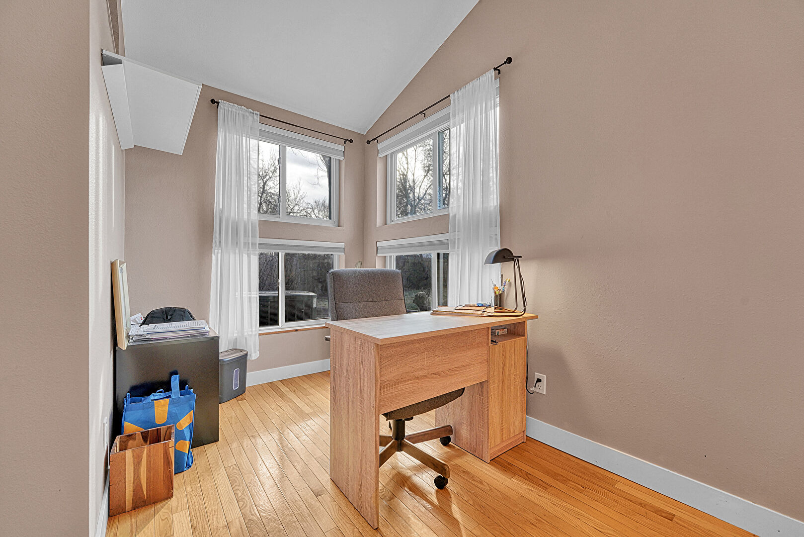Baseboards Wall, Drywall, Office Area, Vaulted Ceiling, Wood Finish Floor, Natural Light