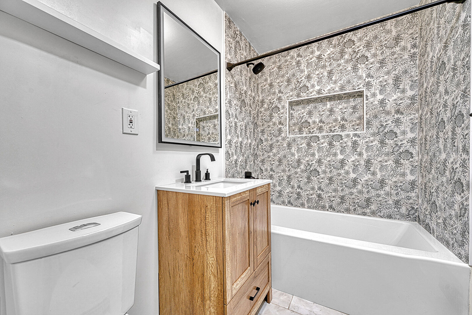 Combined Bath Shower, Full Bathroom, Tile Floor, Vanity, Drywall