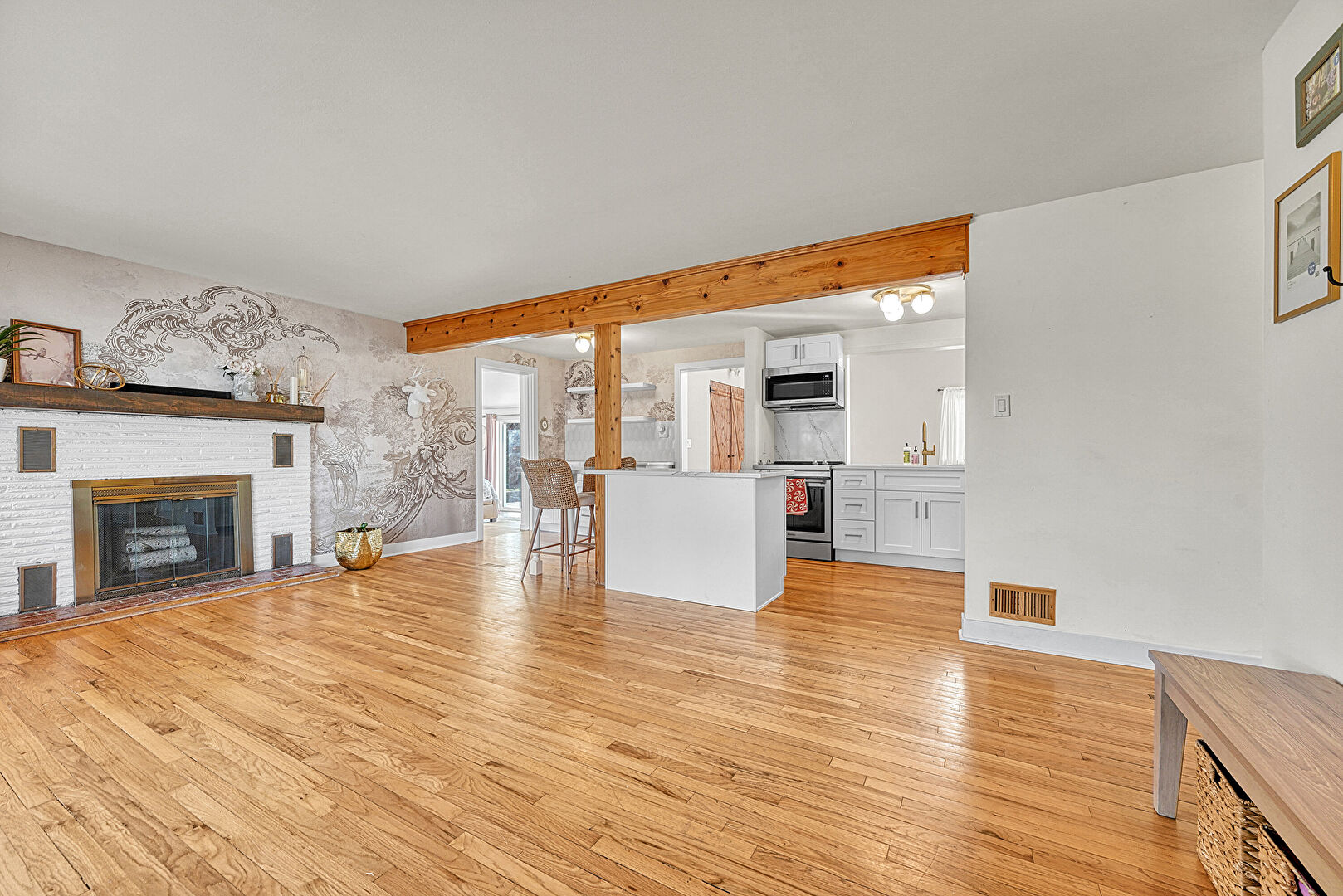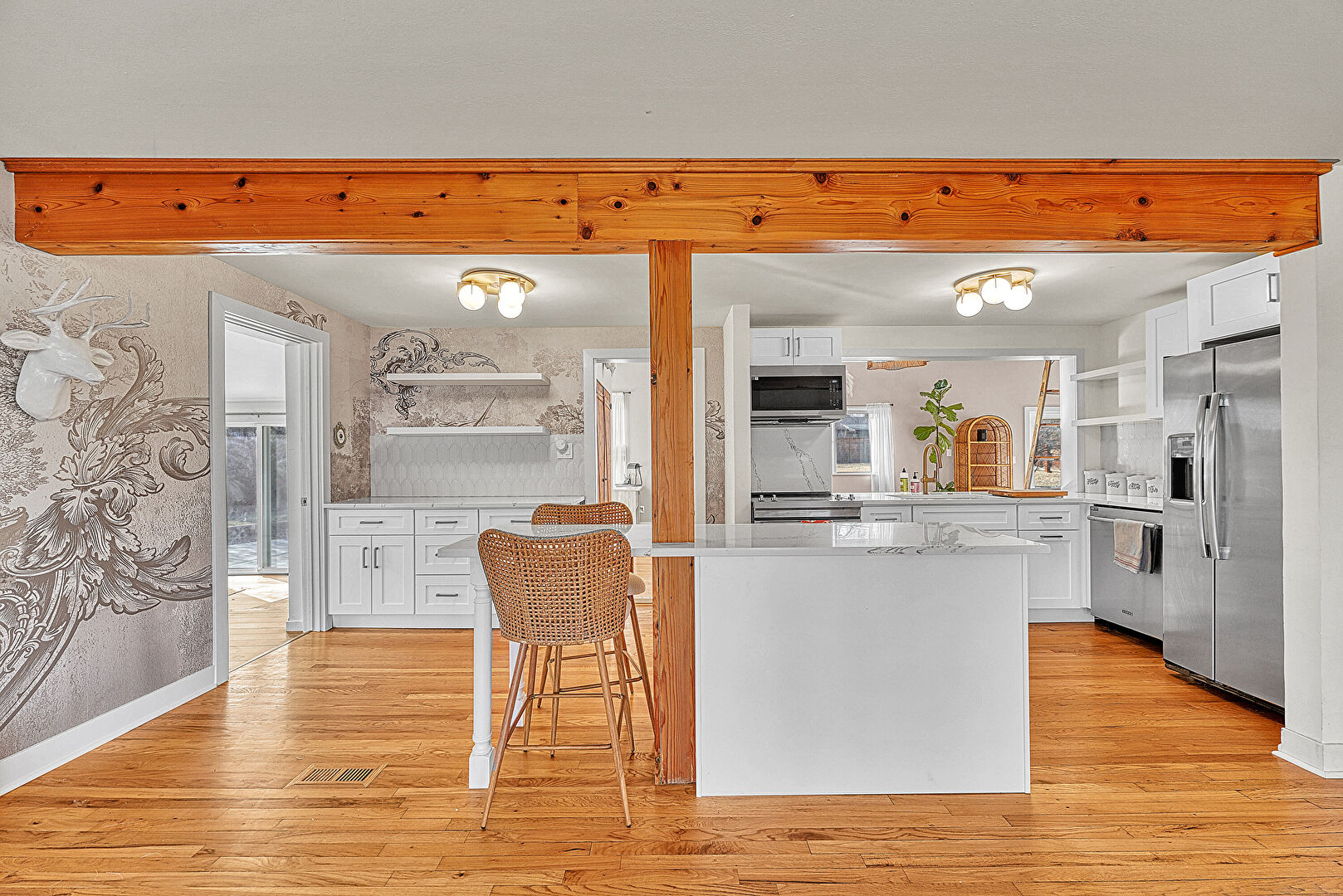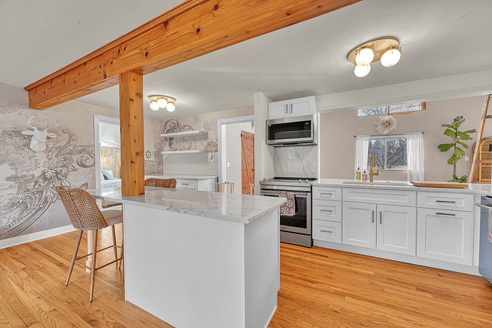 Baseboards Wall, Beamed Ceiling, Drywall, Fireplace, Kitchen Bar, Kitchen Island, L Shaped Kitchen, Natural Light, Open Shelves, Opens To Living Area, Pass Through Window, Shaker Cabinets, Stone Countertops, Vent, Wallpaper Wall, Wood Finish Floor, Natural Light, Open Shelves, Vent, Wood Finish Floor