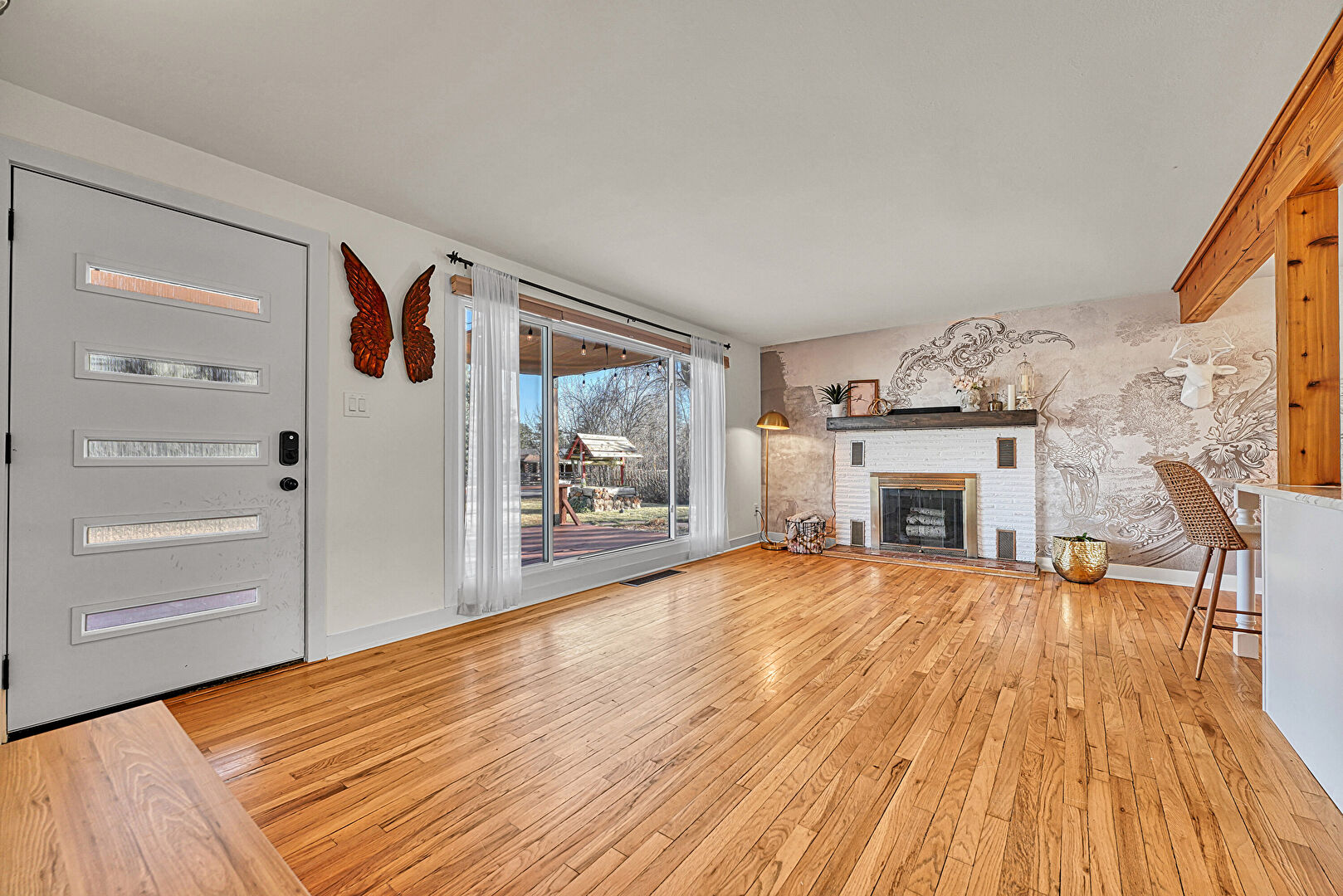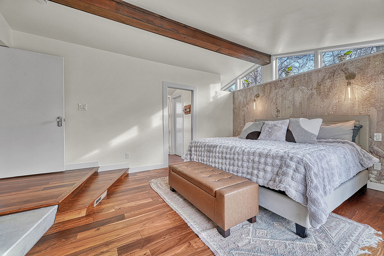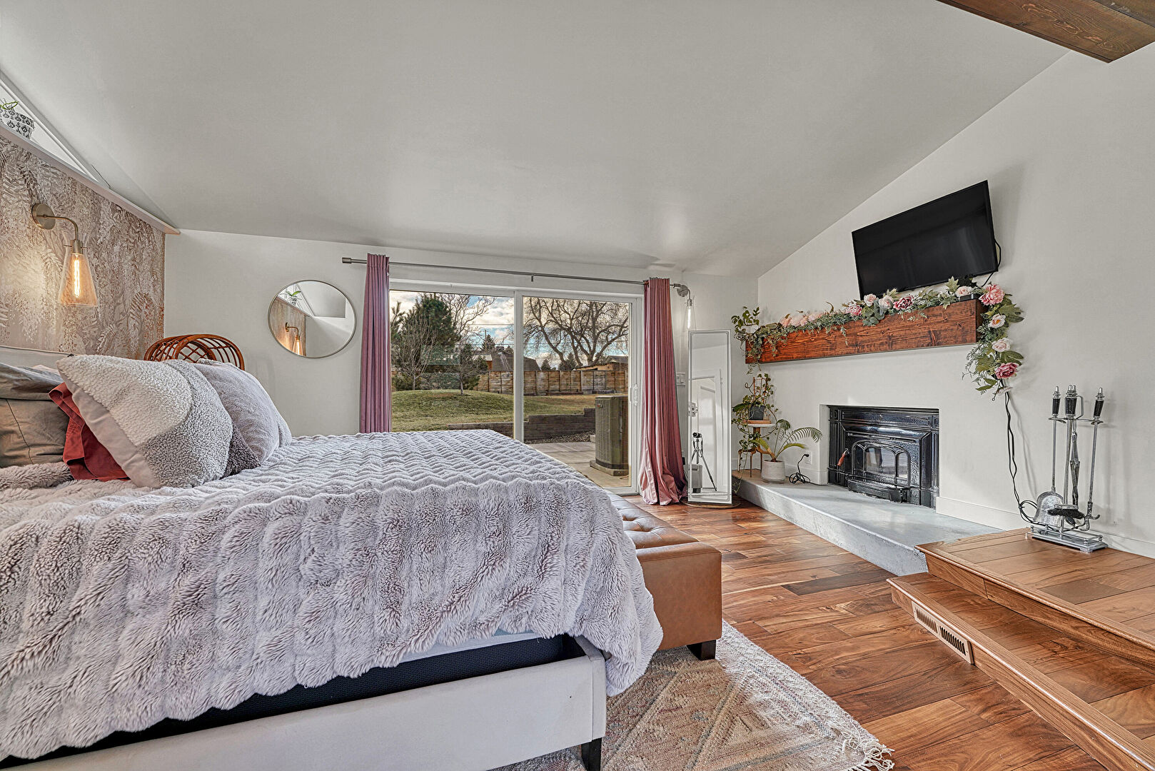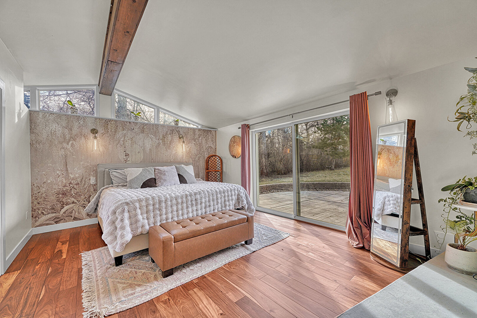 Accent Wall, Access To Exterior, Baseboards Wall, Beamed Ceiling, Drywall, Natural Light, Vaulted Ceiling, Wood Finish Floor, Wood Stove, Baseboards Wall, Cathedral Ceiling, Drywall