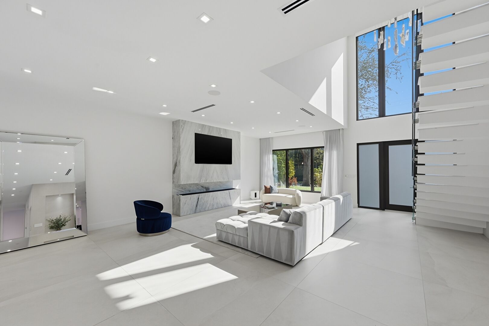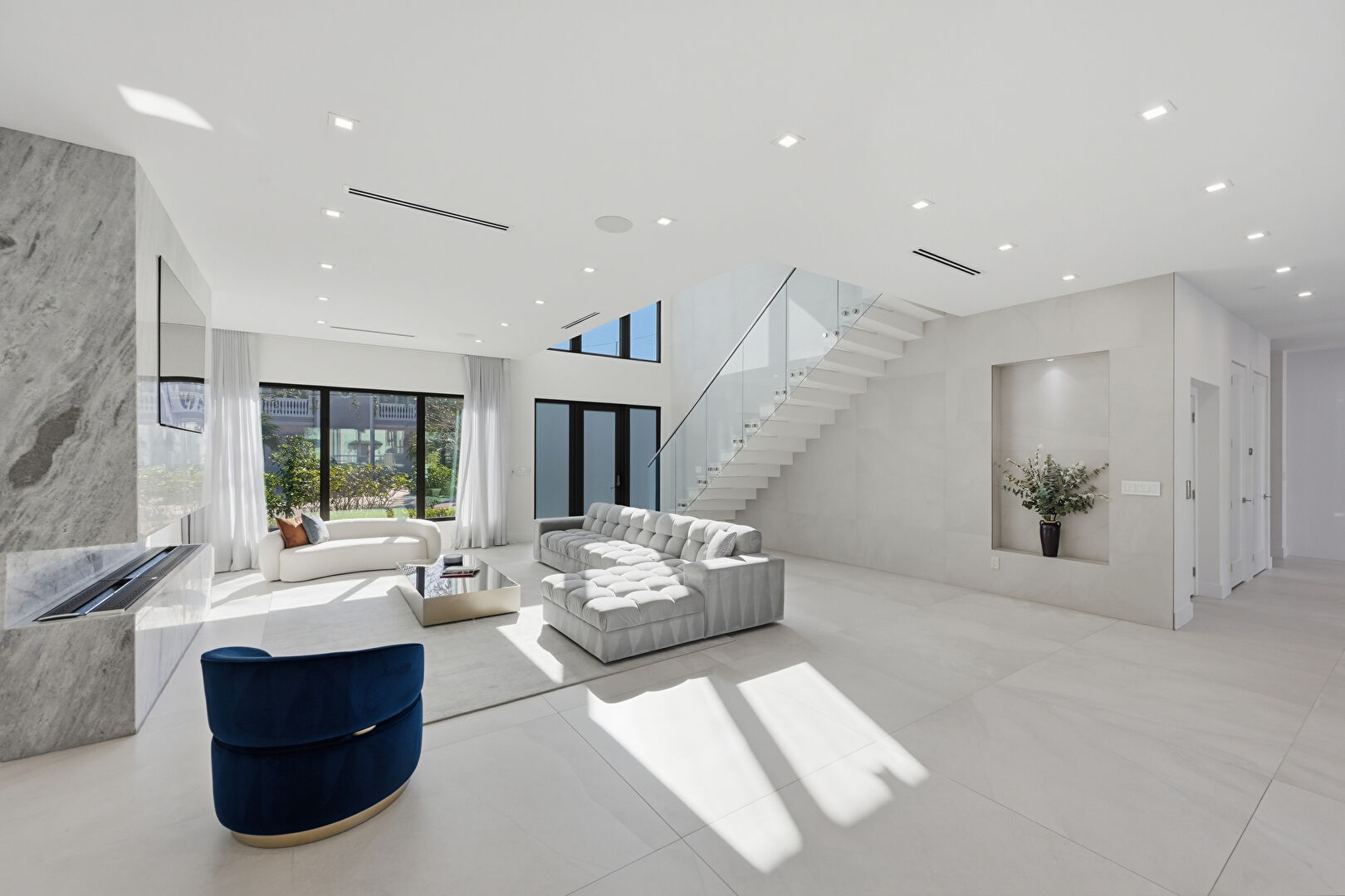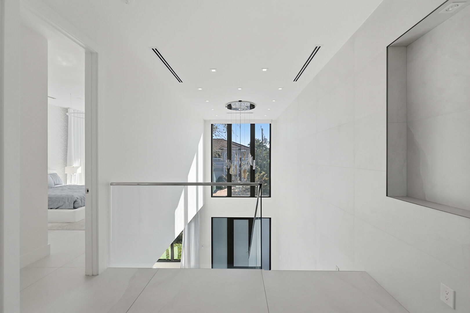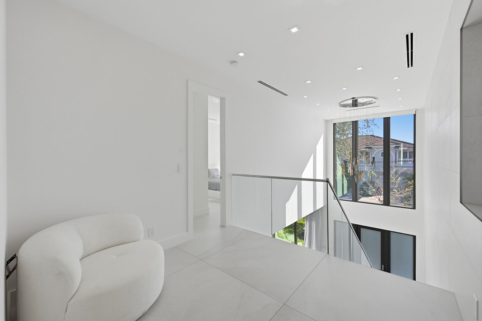 Baseboards Wall, Drywall, Natural Light, Recessed Lighting, Tile Floor, Upstairs Landing, Vent, Floor Ceiling Windows