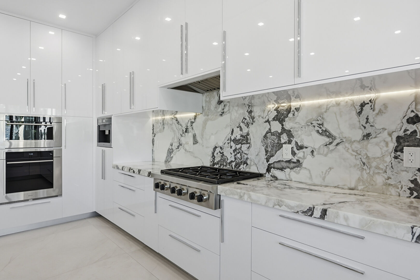 Double Oven, Drywall, Flat Panel Cabinets, Kitchen Bar, Kitchen Island, Marble Finish Floor, Natural Light, Opens To Living Area, Recessed Lighting, Stone Countertops, Tile Floor, U Shaped Kitchen, Vent, Flat Panel Cabinets, Kitchen Island, L Shaped Kitchen, Stone Countertops, U Shaped Kitchen