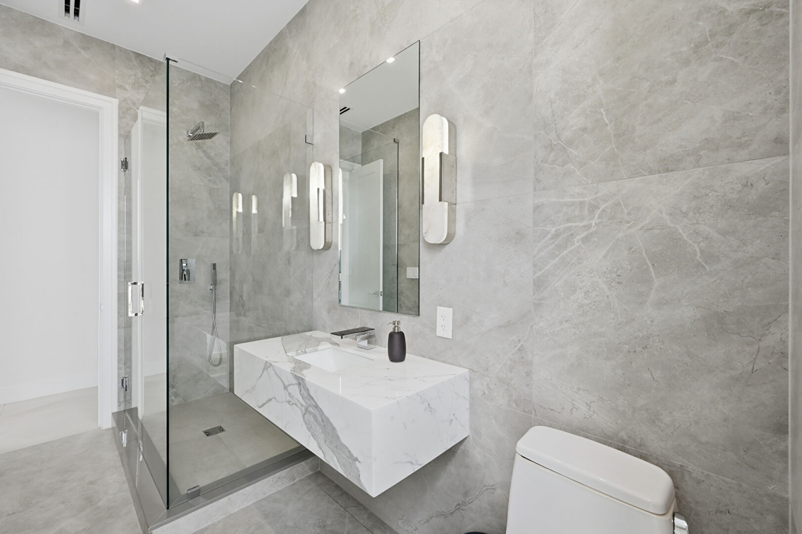 Elevator, Full Bathroom, Marble Finish Floor, Natural Light, Recessed Lighting, Tile Wall, Two Single Vanities, Vanity, Vent, Concrete Floor, Drywall, Full Bathroom, Natural Light, Tile Wall, Vanity