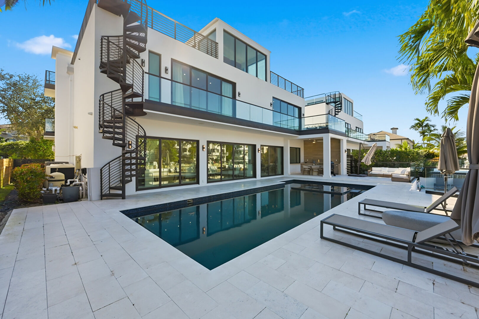Glass Siding, Outdoor Living Space, Patio, Pool, Stairs, Stucco Siding, Balcony, Glass Siding