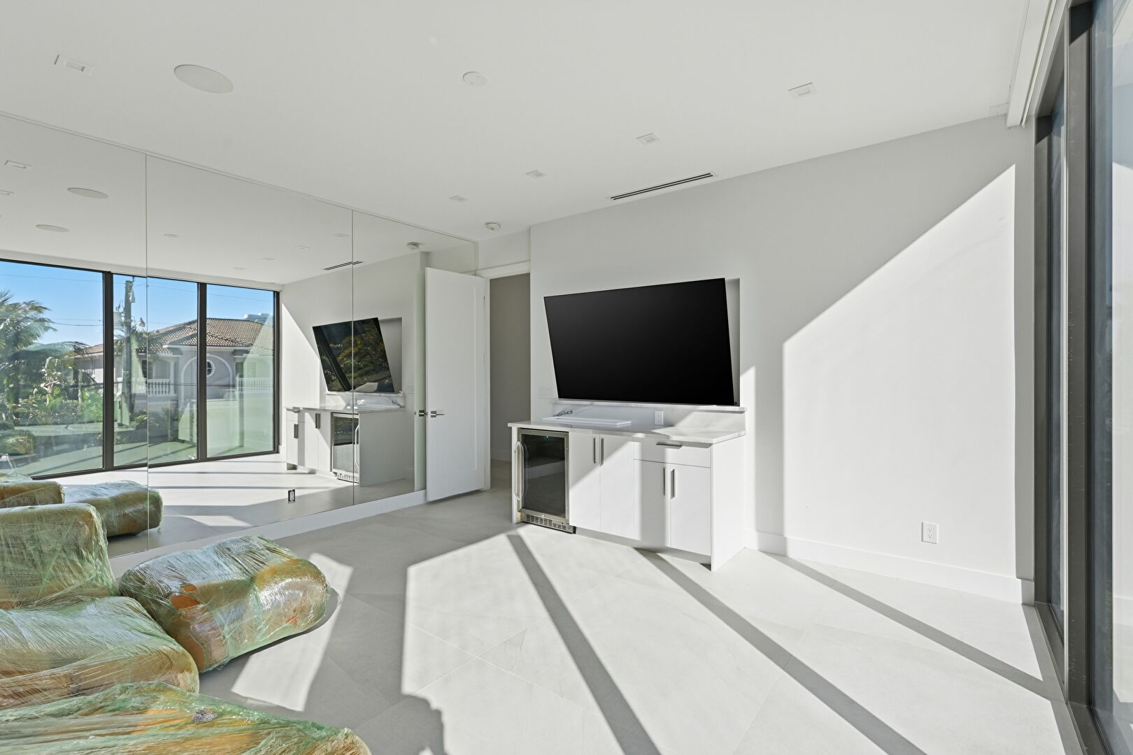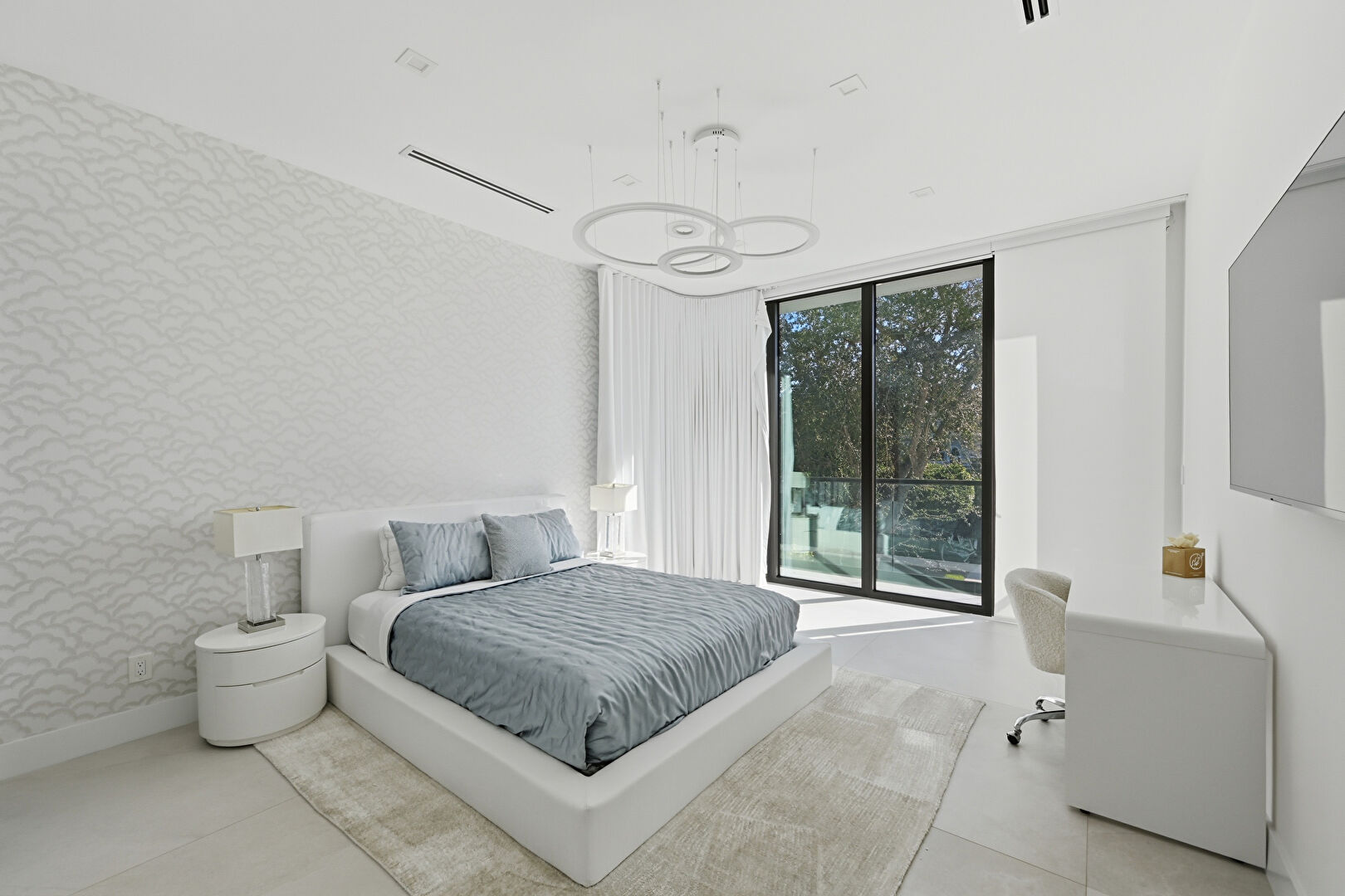 Accent Wall, Access To Exterior, Baseboards Wall, Drywall, Ensuite Bathroom, Natural Light, Office Area, Vent, Wallpaper Wall, Baseboards Wall, Floor Ceiling Windows, Recessed Lighting