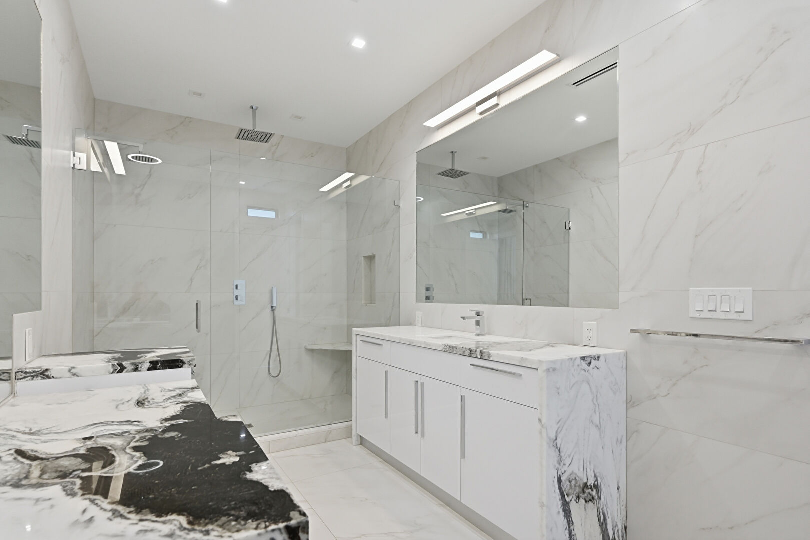 Double Vanity, Full Bathroom, Marble Finish Floor, Marble Wall, Natural Light, Recessed Lighting, Vent, Tile Wall