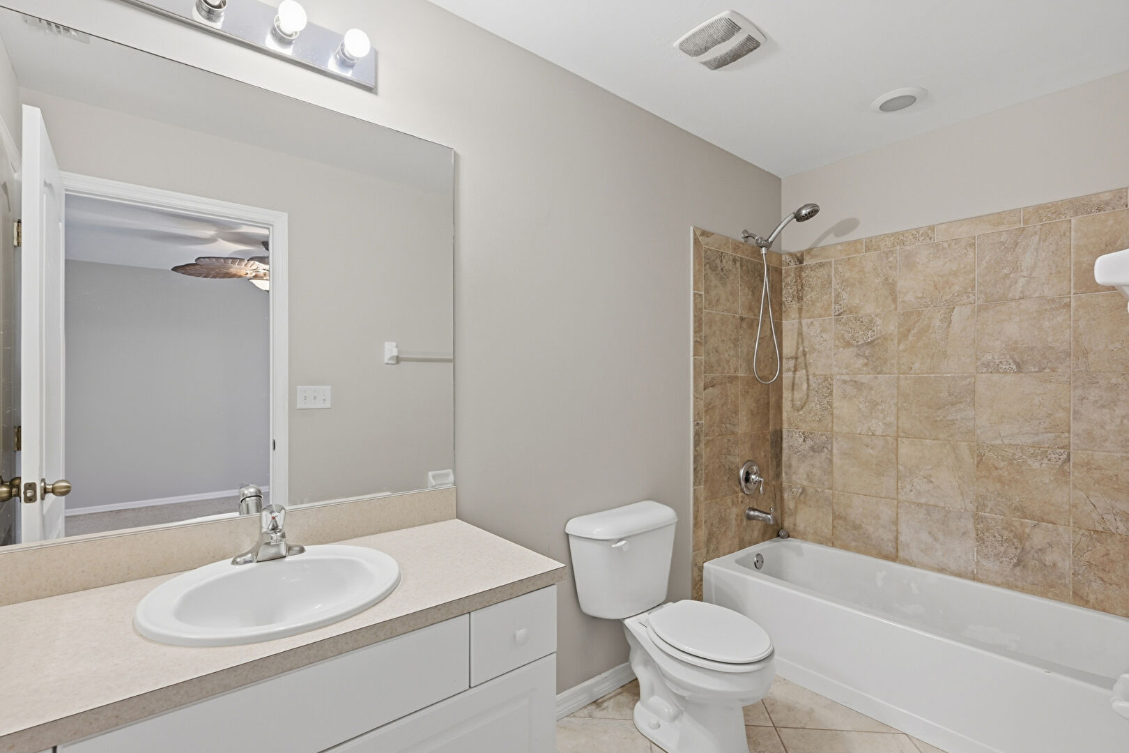 Combined Bath Shower, Drywall, Full Bathroom, Recessed Lighting, Vanity, Vent, Tile Floor
