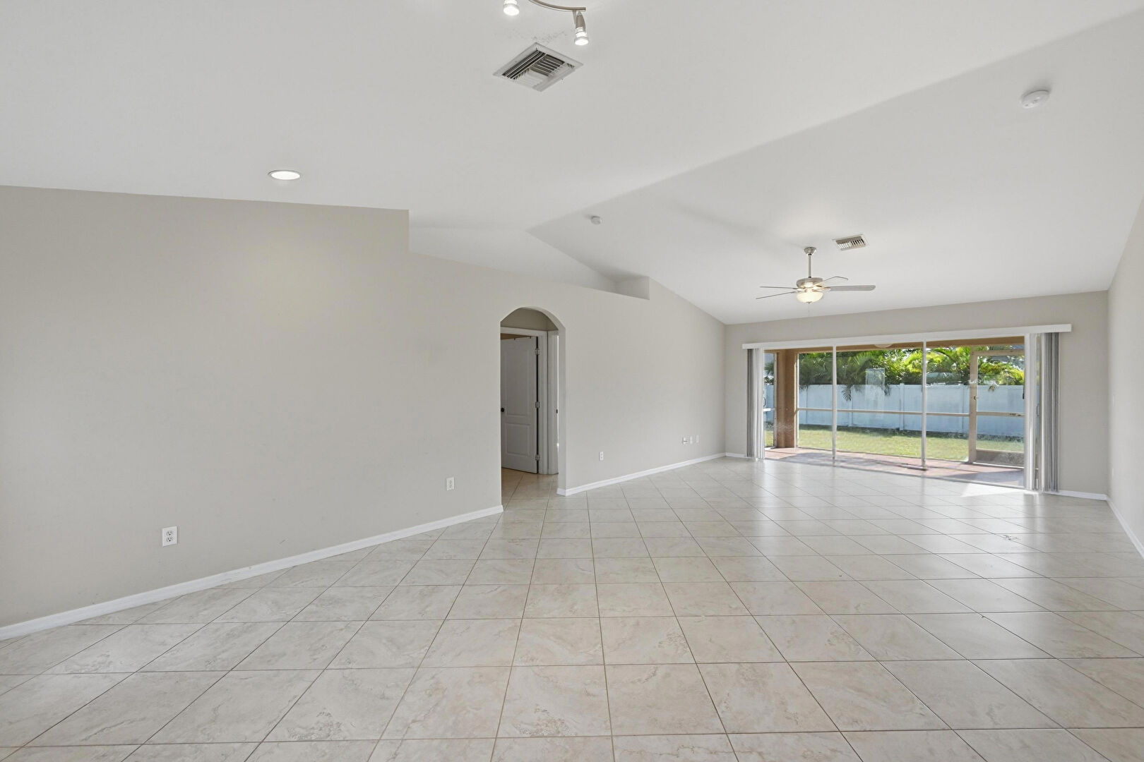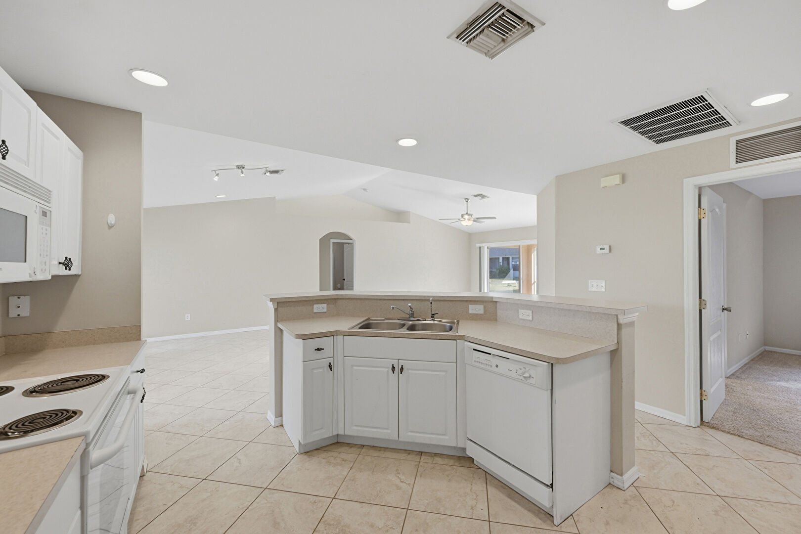 Arched Walkways, Baseboards Wall, Cathedral Ceiling, Ceiling Fan, Drywall, French Doors, L Shaped Kitchen, Natural Light, Recessed Lighting, Tile Floor, Vaulted Ceiling, Vent, Cathedral Ceiling, Tile Floor, Vaulted Ceiling