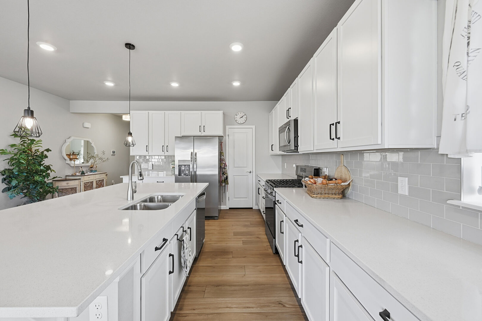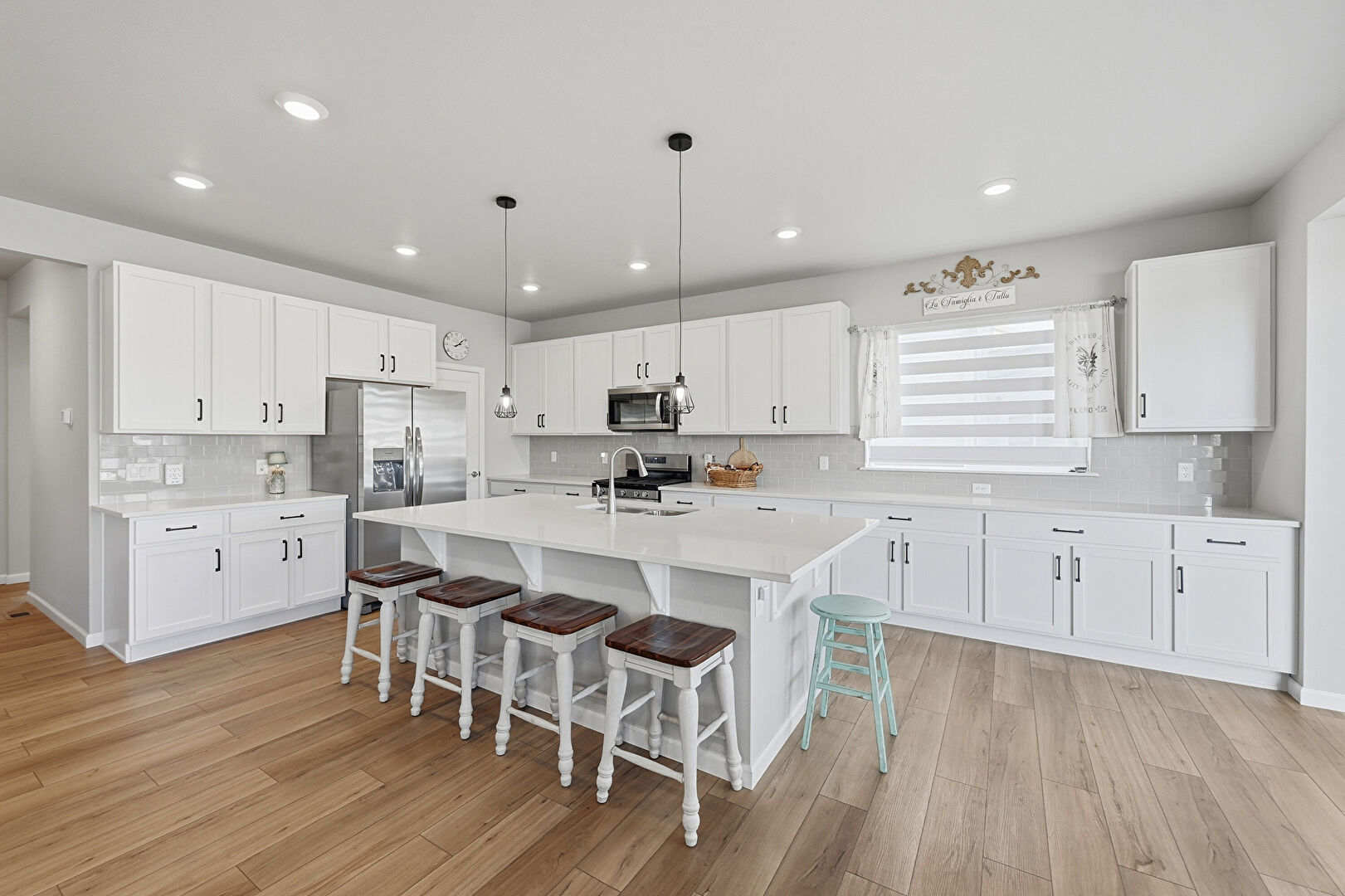 Drywall, Kitchen Bar, Kitchen Island, L Shaped Kitchen, Natural Light, Opens To Living Area, Pendant Lighting, Recessed Lighting, Shaker Cabinets, Stone Countertops, Wood Finish Floor, Baseboards Wall, Kitchen Island