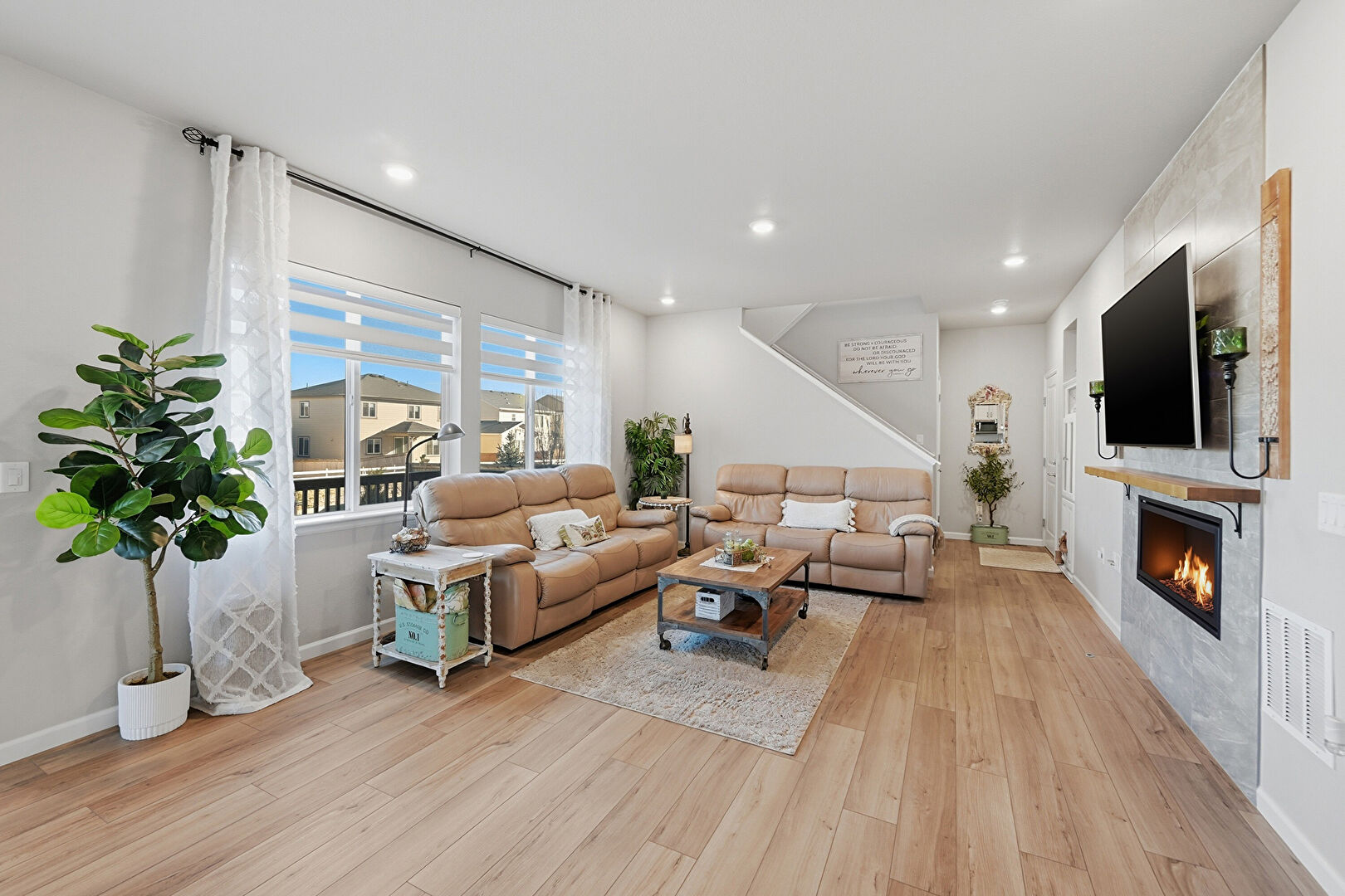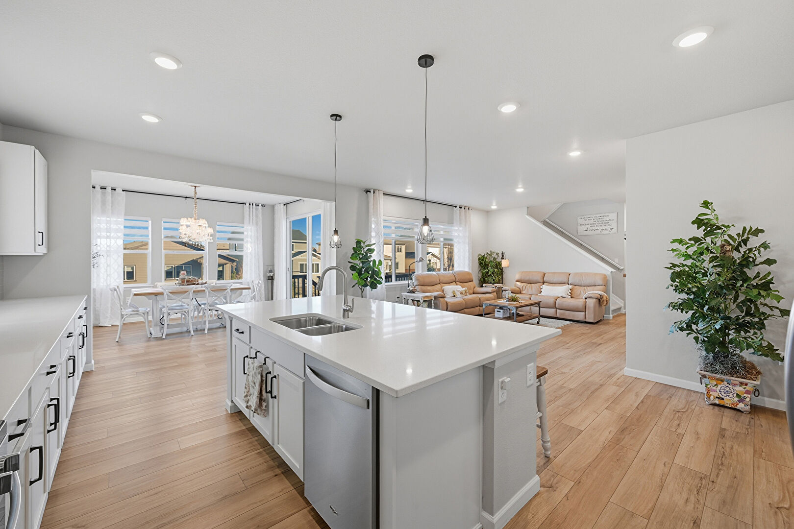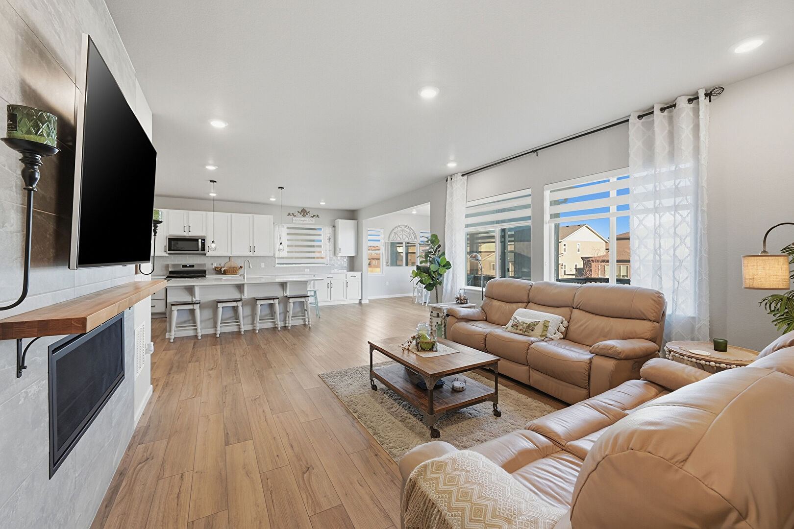 Baseboards Wall, Drywall, Fireplace, L Shaped Kitchen, Natural Light, Notable Chandelier, Recessed Lighting, Wood Finish Floor, Baseboards Wall, Recessed Lighting
