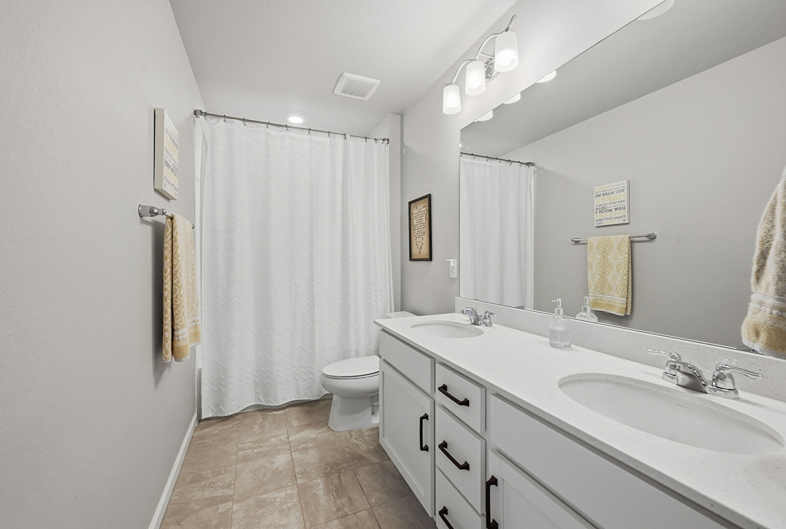 Baseboards Wall, Combined Bath Shower, Double Vanity, Drywall, Full Bathroom, Vanity, Vent, Baseboards Wall, Full Bathroom