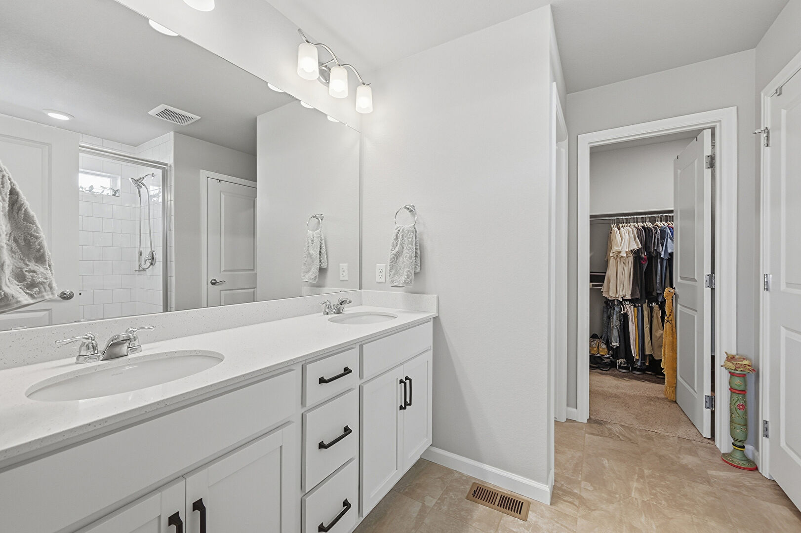Baseboards Wall, Double Vanity, Drywall, Full Bathroom, Natural Light, Recessed Lighting, Vent, Walk In Closet