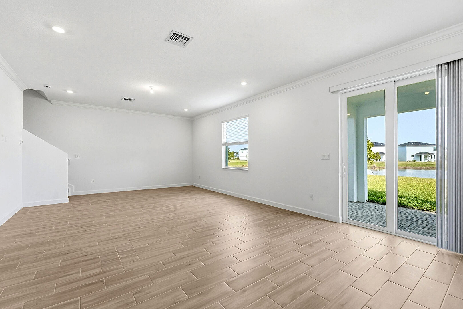 Baseboards Wall, Crown Molding, Drywall, L Shaped Kitchen, Natural Light, Recessed Lighting, Stairs, Vent, Water View, Wood Finish Floor, Crown Molding, Drywall, Vent