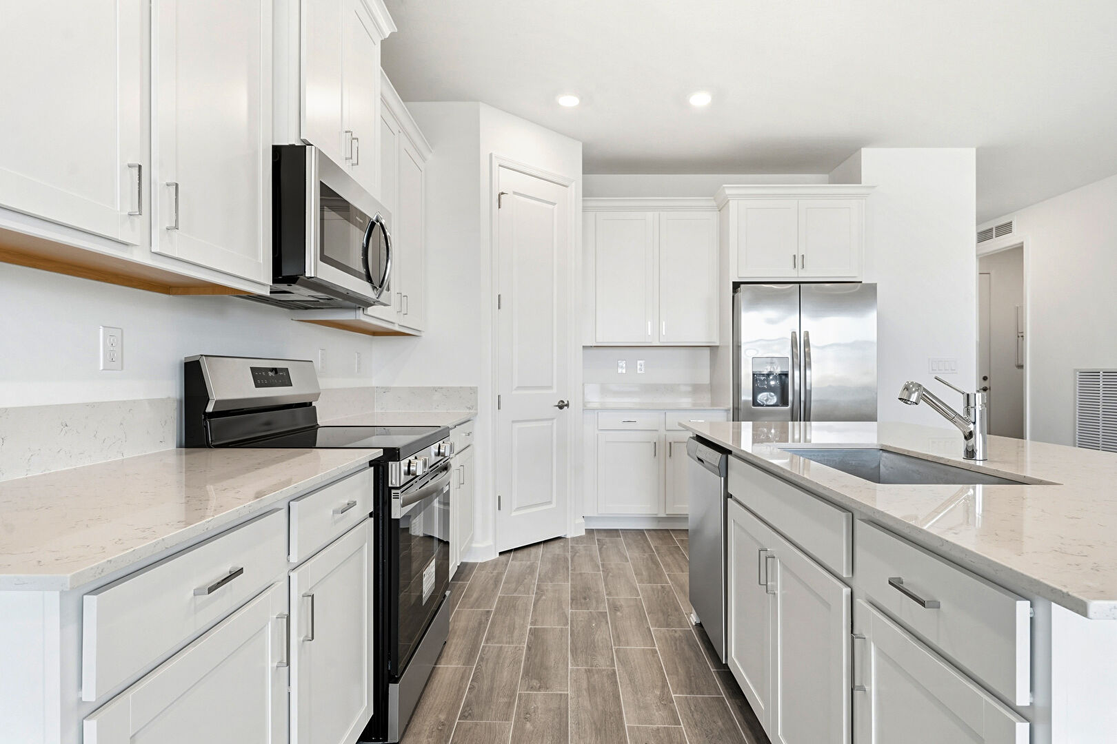Baseboards Wall, Crown Molding Cabinets, Drywall, L Shaped Kitchen, Recessed Lighting, Shaker Cabinets, Stone Countertops, Vent, Wood Finish Floor, Kitchen Island