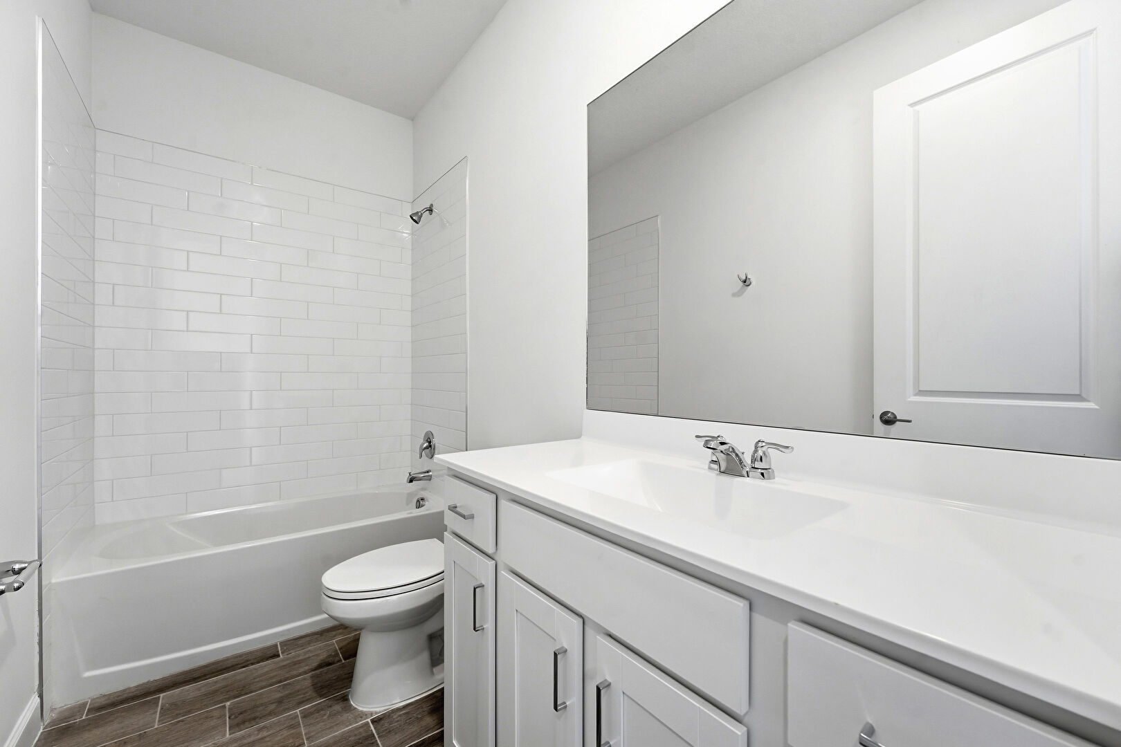 Drywall, Full Bathroom, Vanity, Wood Finish Floor, Combined Bath Shower