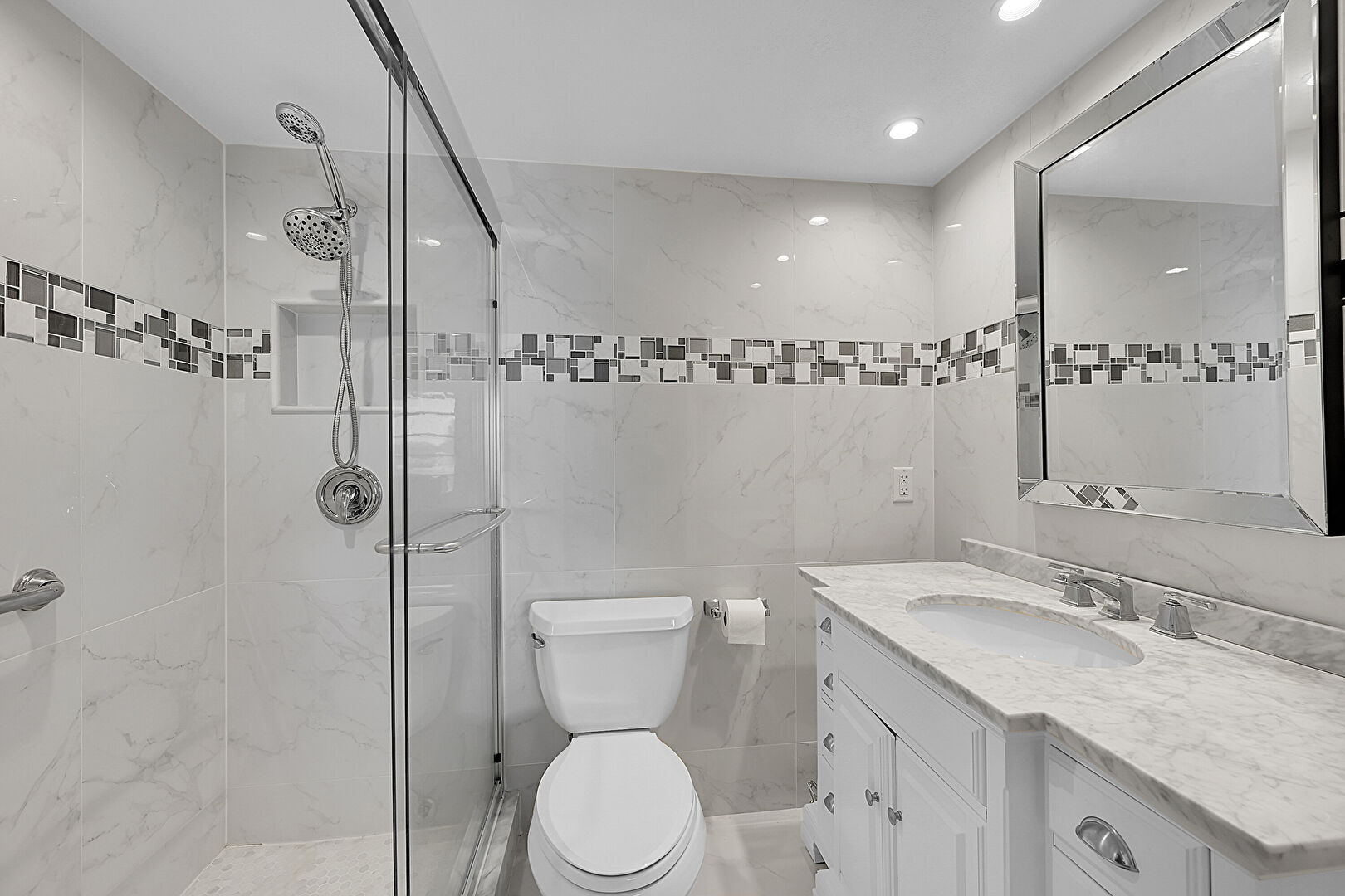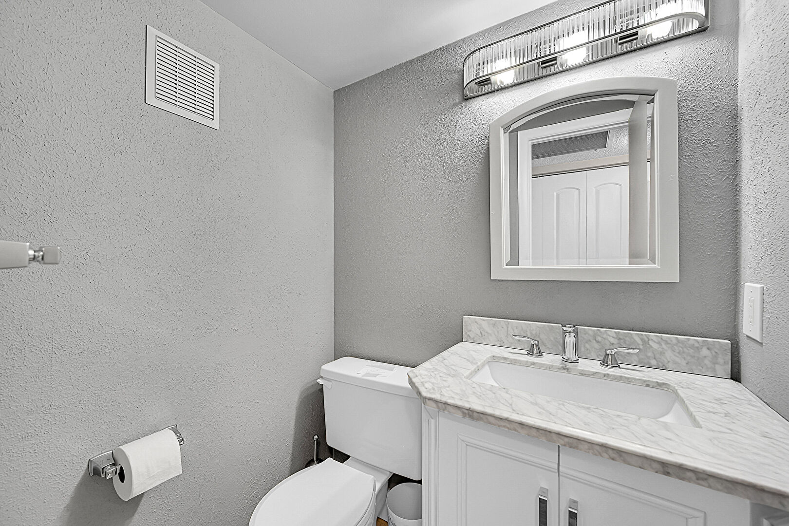 Half Bathroom, Recessed Lighting, Tile Wall, Vanity, Vent, Full Bathroom, Textured Wall