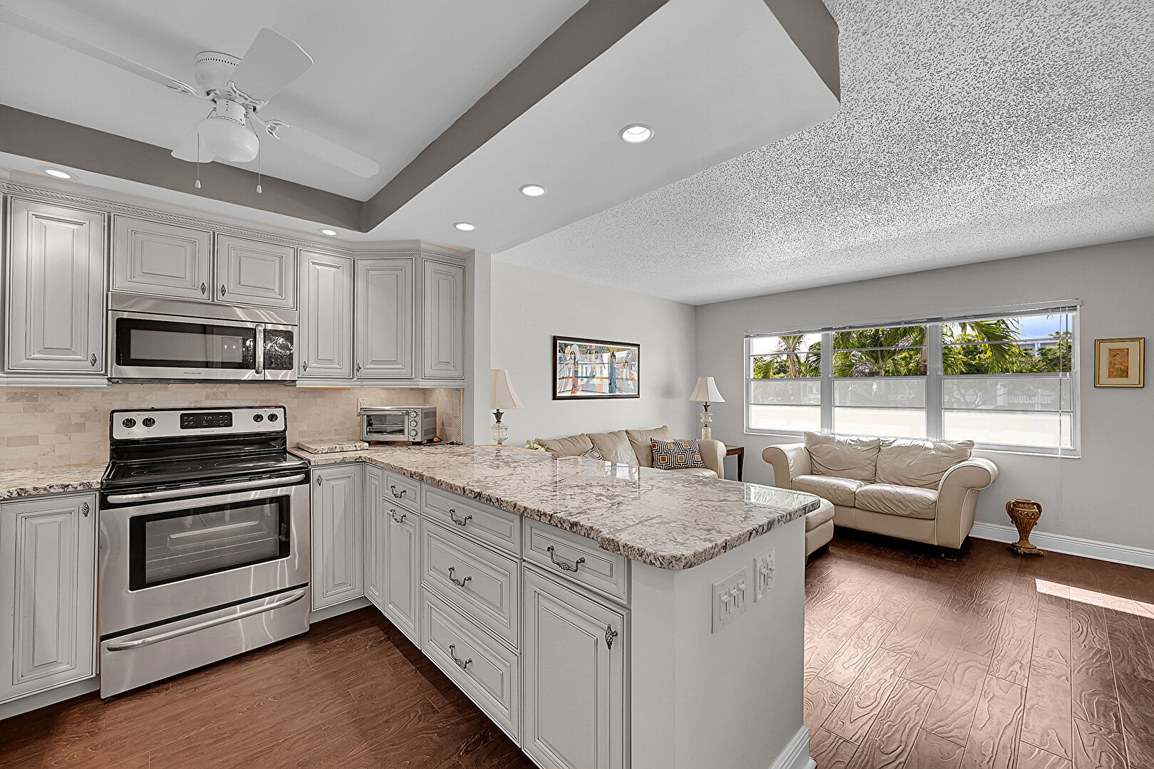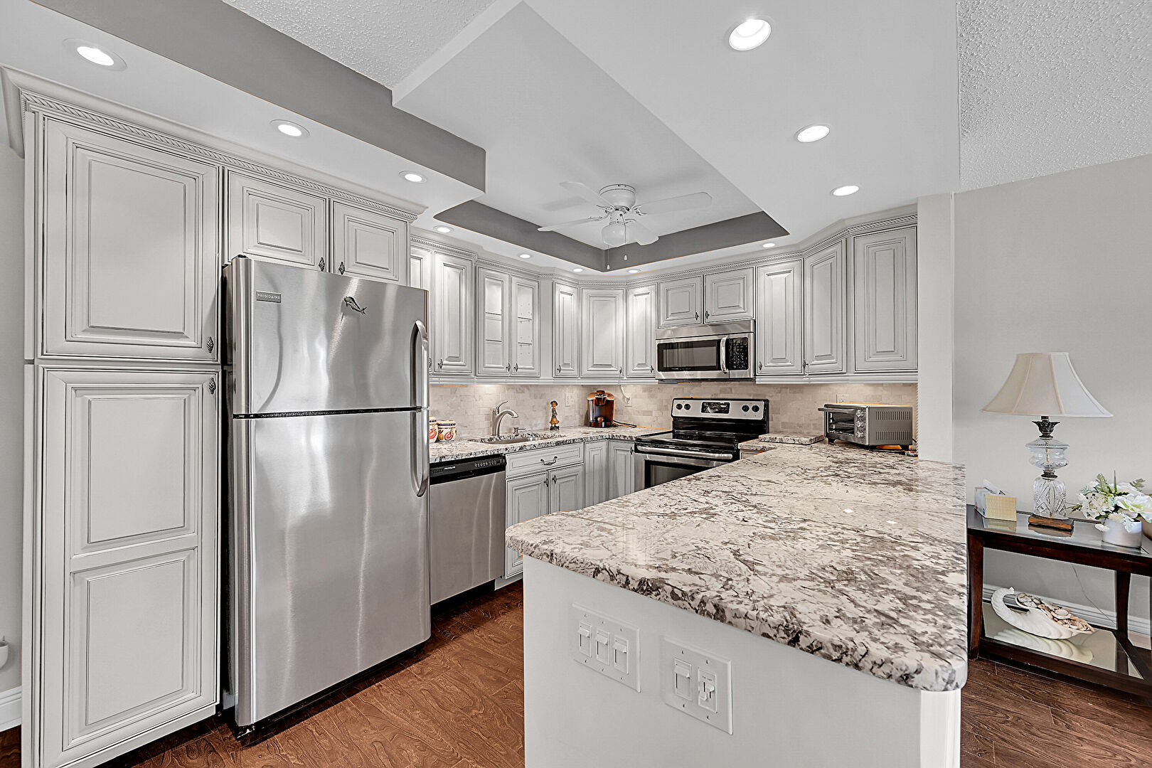 Baseboards Wall, Ceiling Fan, Crown Molding Cabinets, Drywall, Glass Insert Cabinets, Kitchen Peninsula, Natural Light, Notable Chandelier, Opens To Living Area, Pendant Lighting, Raised Cabinets, Recessed Lighting, Stone Countertops, Textured Ceiling, Toaster, Tray Ceiling, U Shaped Kitchen, Wood Finish Floor, Natural Light, Raised Cabinets, Textured Ceiling, Wood Finish Floor