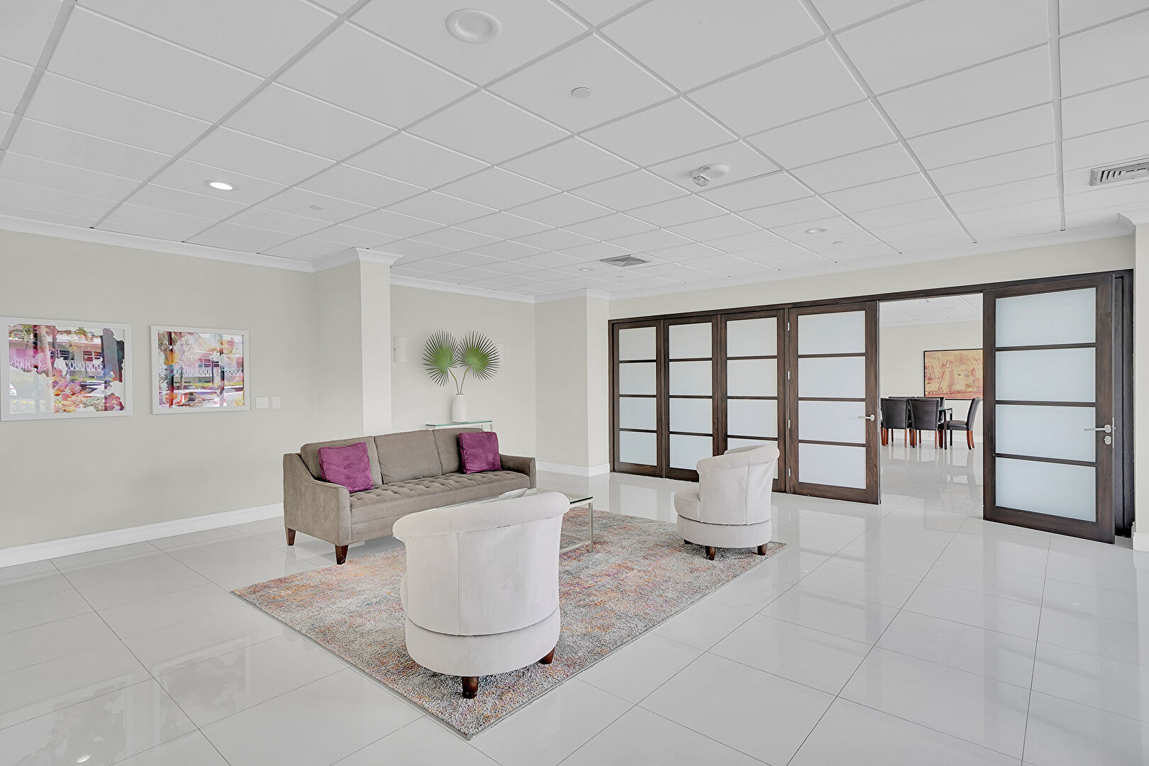 Crown Molding, Drop Ceiling, Drywall, Floor Ceiling Windows, Natural Light, Recessed Lighting, Tile Floor, Vent, Baseboards Wall, Vent