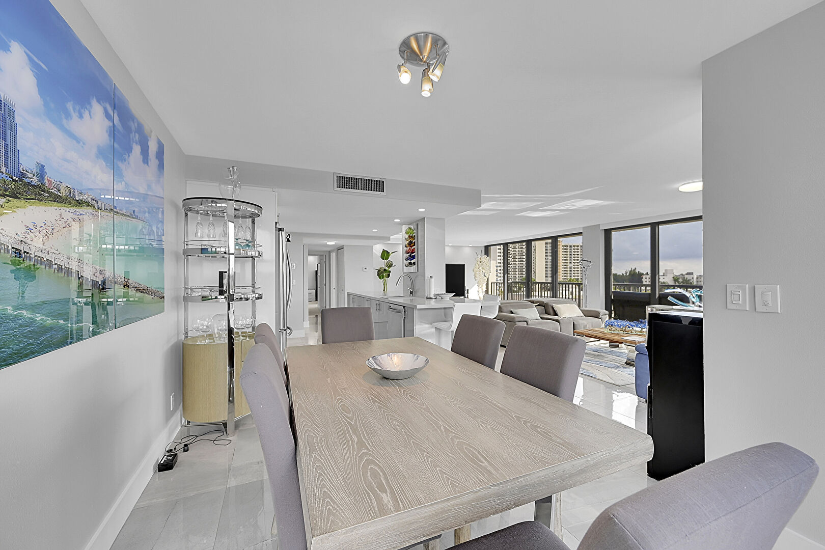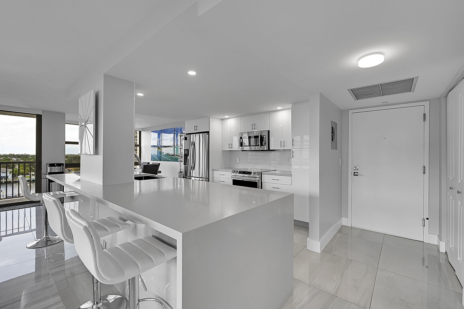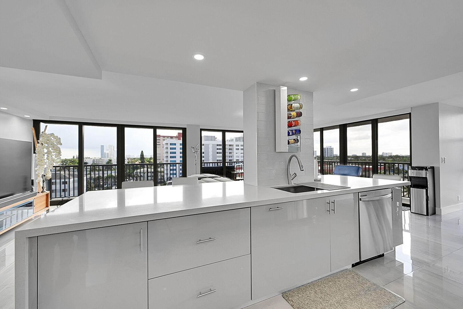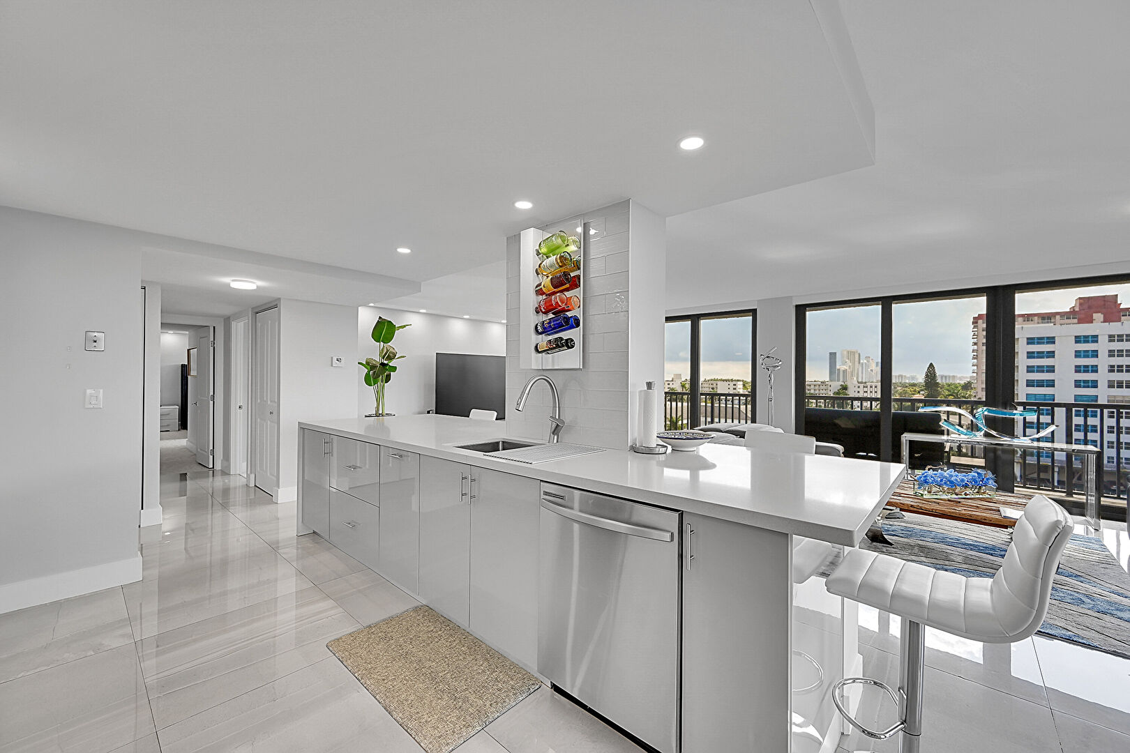 Baseboards Wall, City View, Drywall, Flat Panel Cabinets, Floor Ceiling Windows, Galley Kitchen, Kitchen Bar, Kitchen Island, Kitchen Peninsula, Marble Finish Floor, Natural Light, One Wall Kitchen, Opens To Living Area, Recessed Lighting, Stone Countertops, Tile Floor, Vent, City View, Drywall, Flat Panel Cabinets, Stone Countertops, Tile Floor, Vent