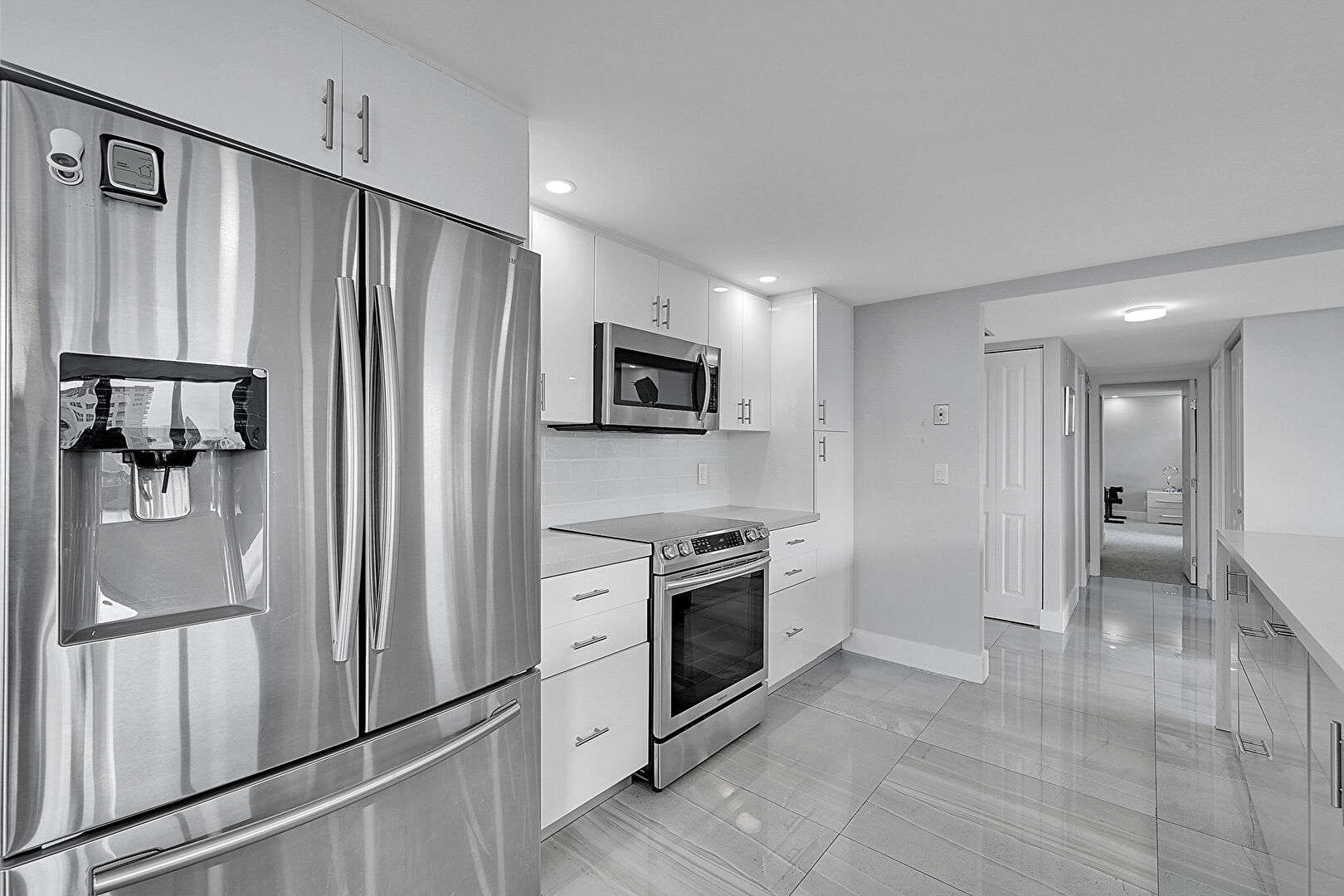 Baseboards Wall, City View, Drywall, Floor Ceiling Windows, Natural Light, Recessed Lighting, Tile Floor, U Shaped Kitchen, Vent, Drywall, Floor Ceiling Windows, Natural Light, Vent