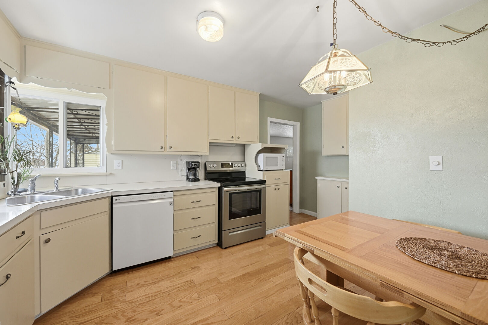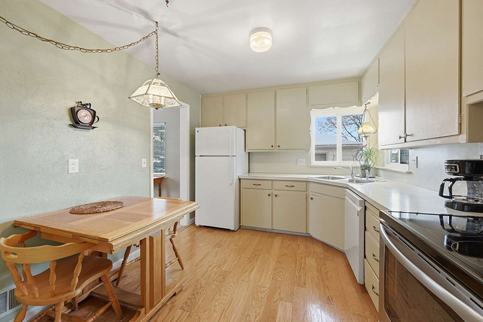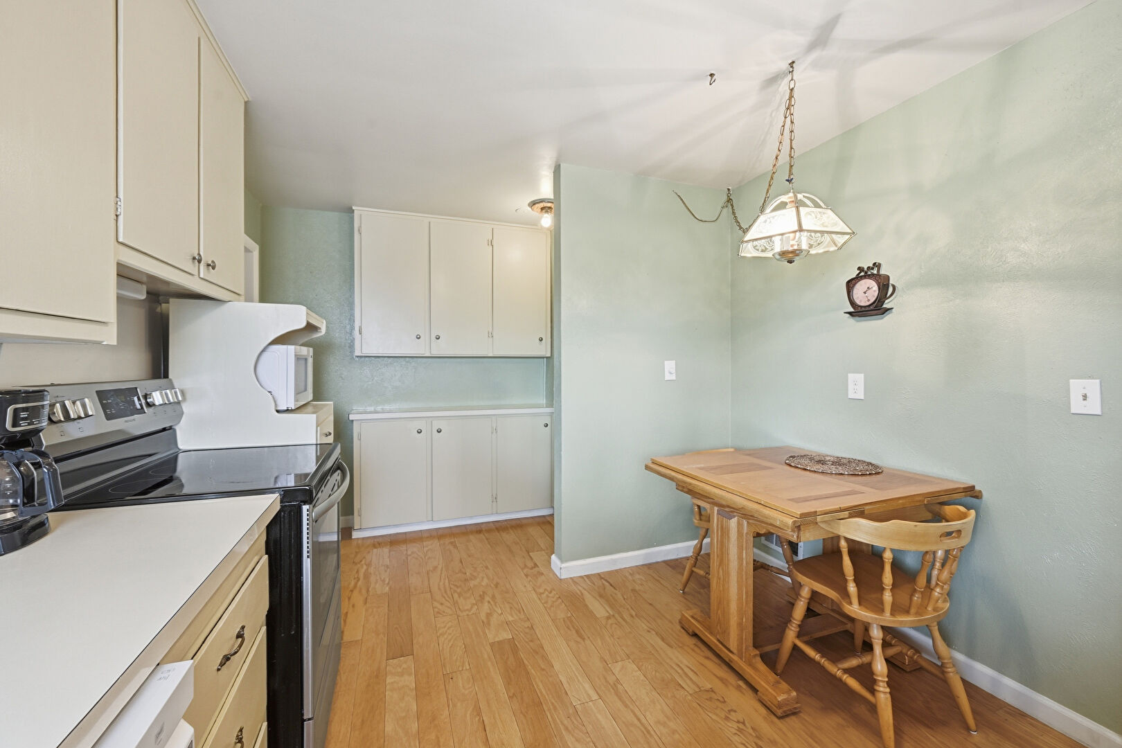 Baseboards Wall, Cream Cabinets, Drywall, Natural Light, Pendant Lighting, Textured Wall, Vent, Visible Hinge Cabinets, Wood Finish Floor, Natural Light, Pendant Lighting, Wood Finish Floor