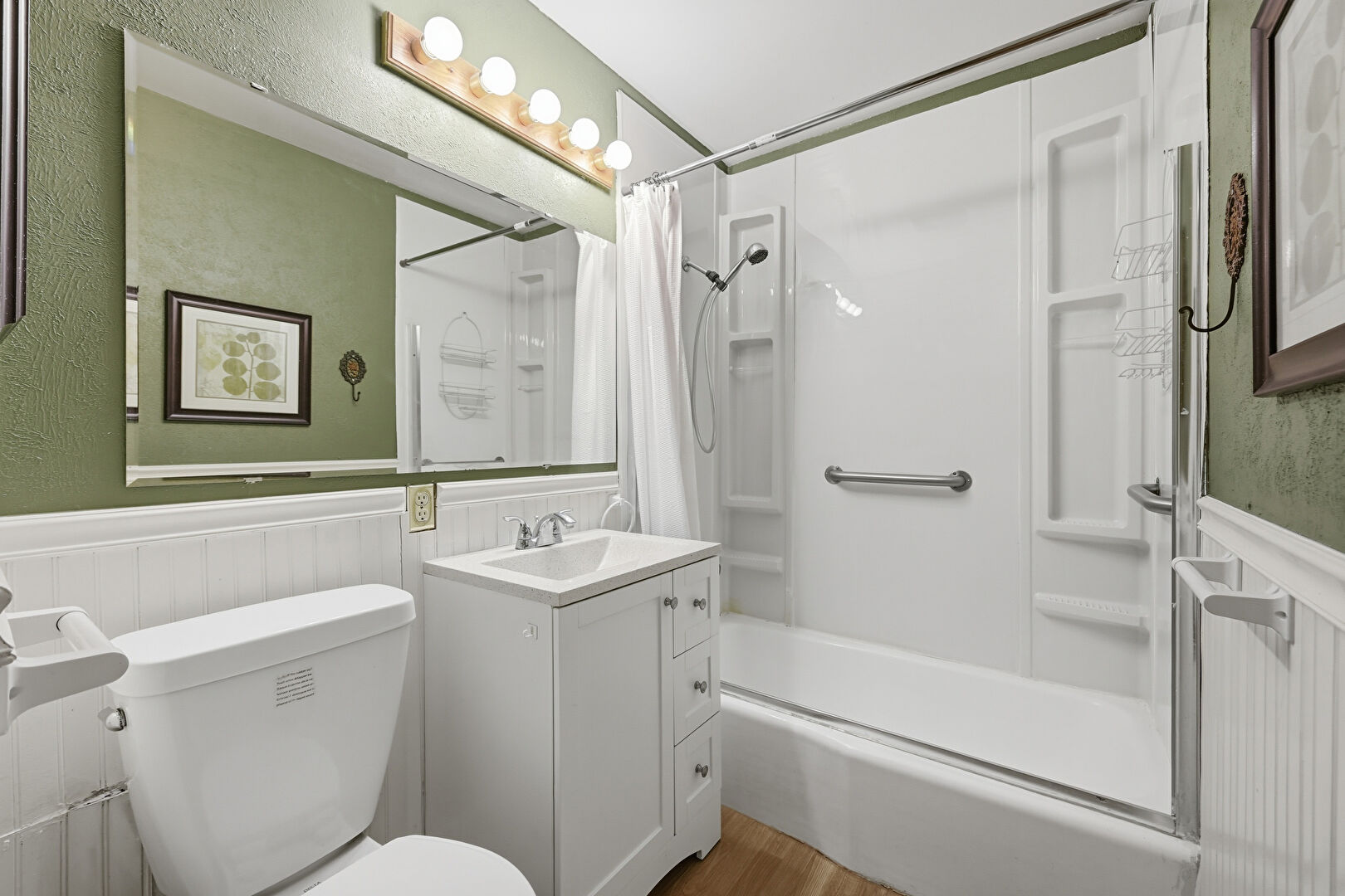 Combined Bath Shower, Full Bathroom, Paneling Wall, Vanity, Wainscot Wall, Wood Finish Floor, Textured Wall