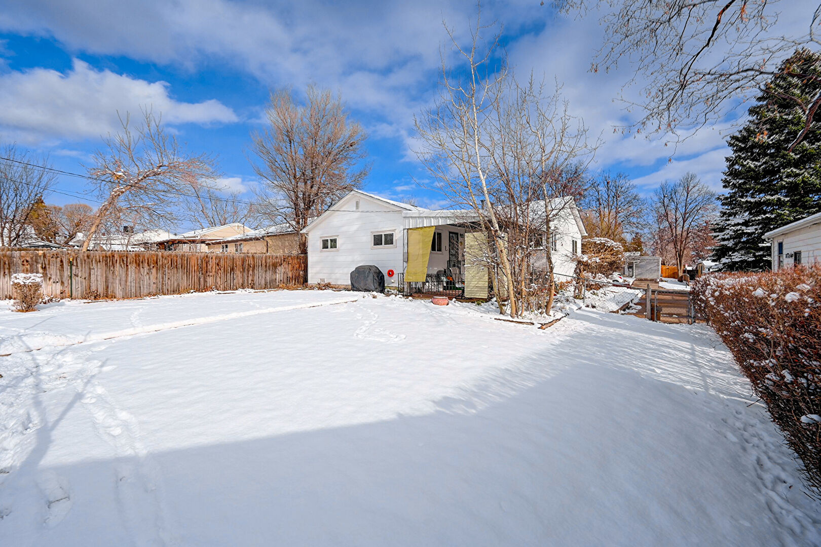 Concrete Foundation, Downspout, Entry Steps, Fence, Gutters, Horizontal Siding, Outdoor Structure, Satellite Dish, Stoop, Concrete Foundation, Gutters, Horizontal Siding, Satellite Dish