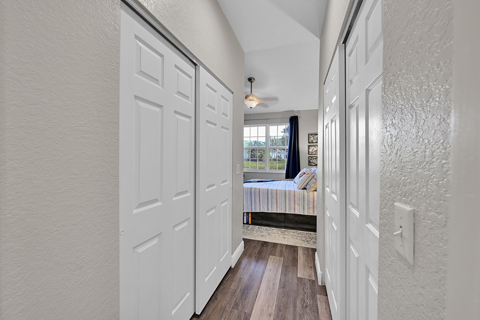 Baseboards Wall, Ceiling Fan, Closet, Drywall, Natural Light, Office Area, Textured Wall, Vaulted Ceiling, Vent, Wood Finish Floor, Baseboards Wall, Natural Light, Vaulted Ceiling, Wood Finish Floor