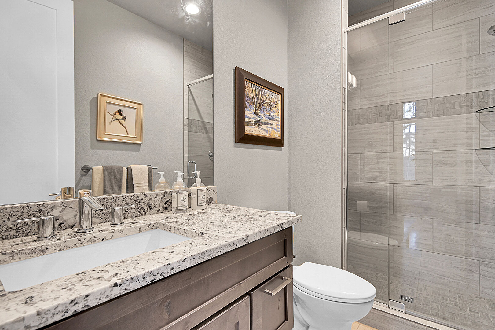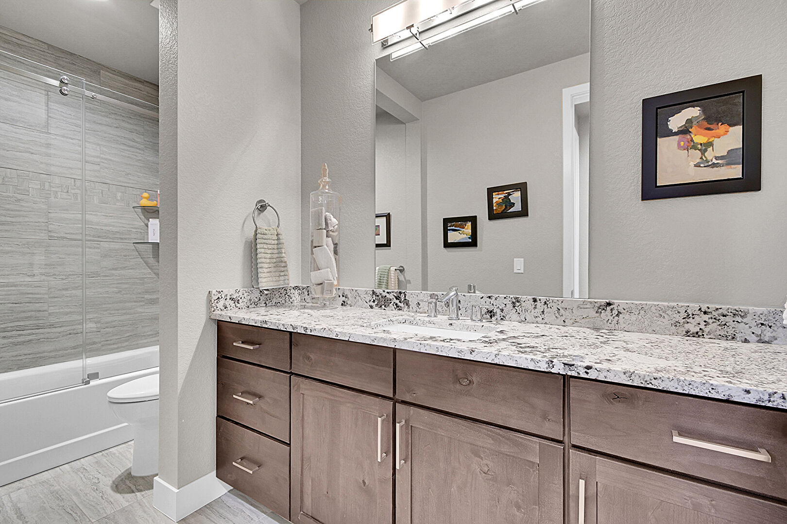 Baseboards Wall, Combined Bath Shower, Drywall, Ensuite Bathroom, Full Bathroom, Natural Light, Textured Wall, Tile Floor, Two Single Vanities, Vanity, Wood Finish Floor, Full Bathroom, Textured Wall, Vanity, Vent