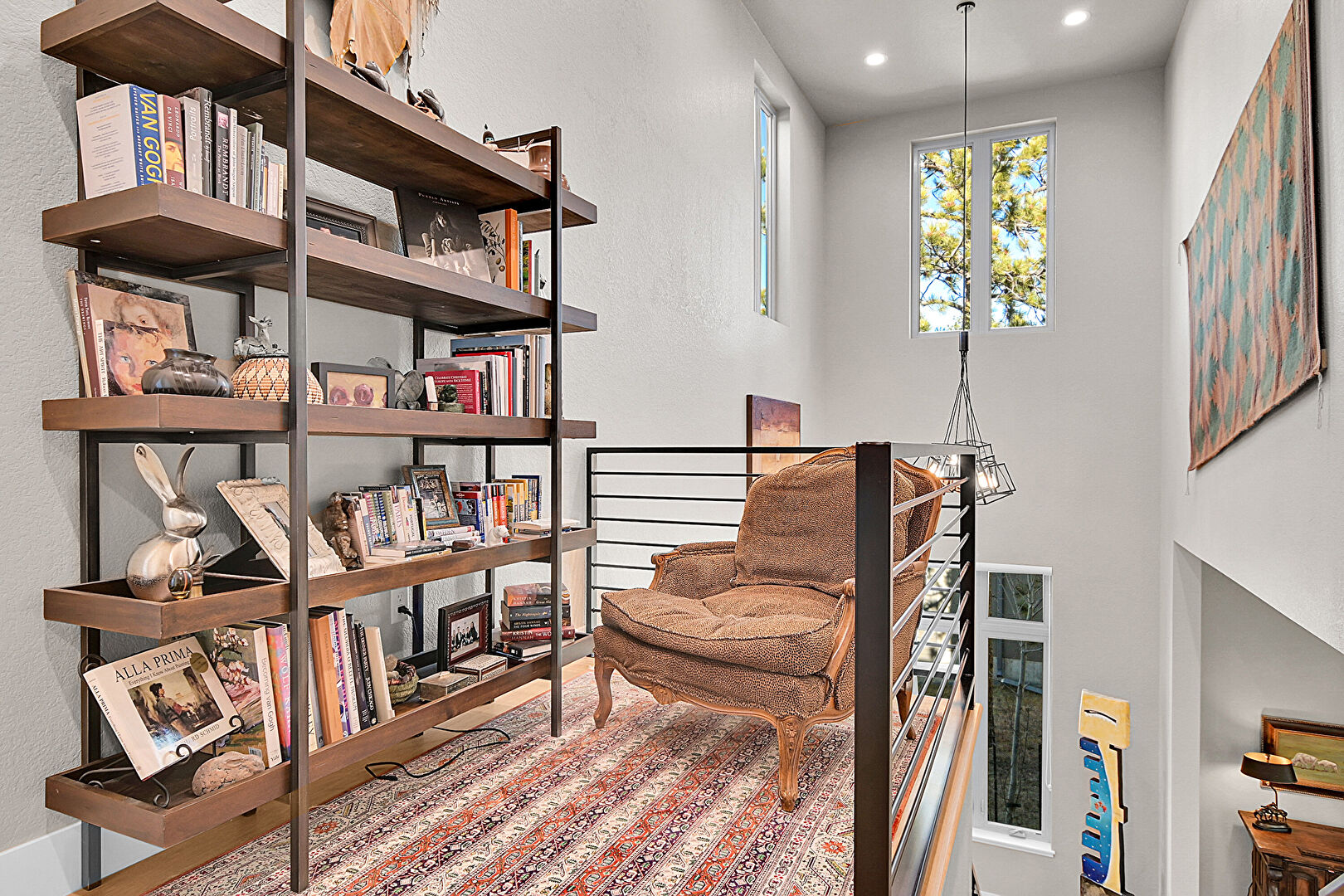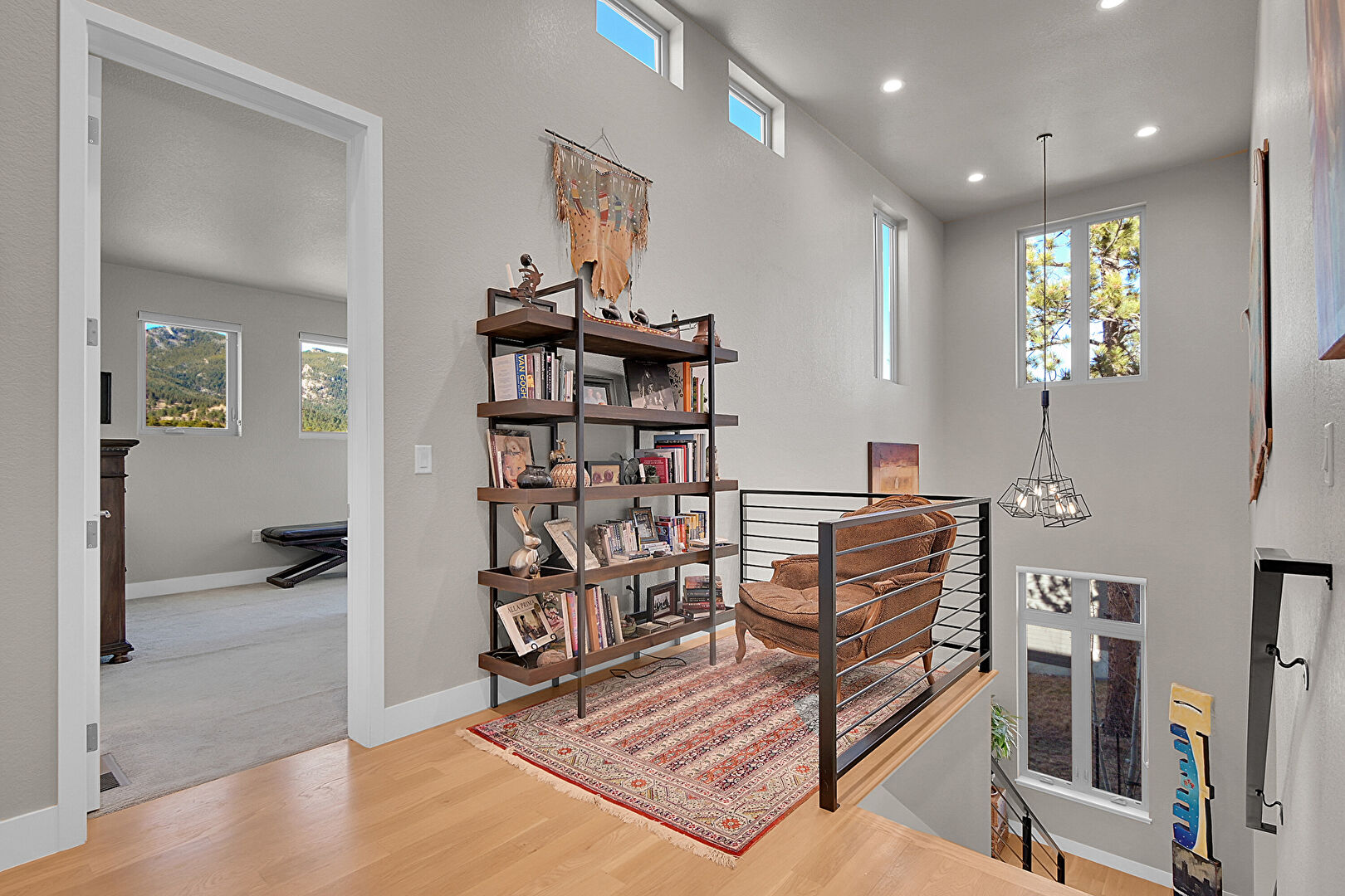 Baseboards Wall, Drywall, Natural Light, Notable Chandelier, Recessed Lighting, Upstairs Landing, Wood Finish Floor, High Ceiling, Textured Wall