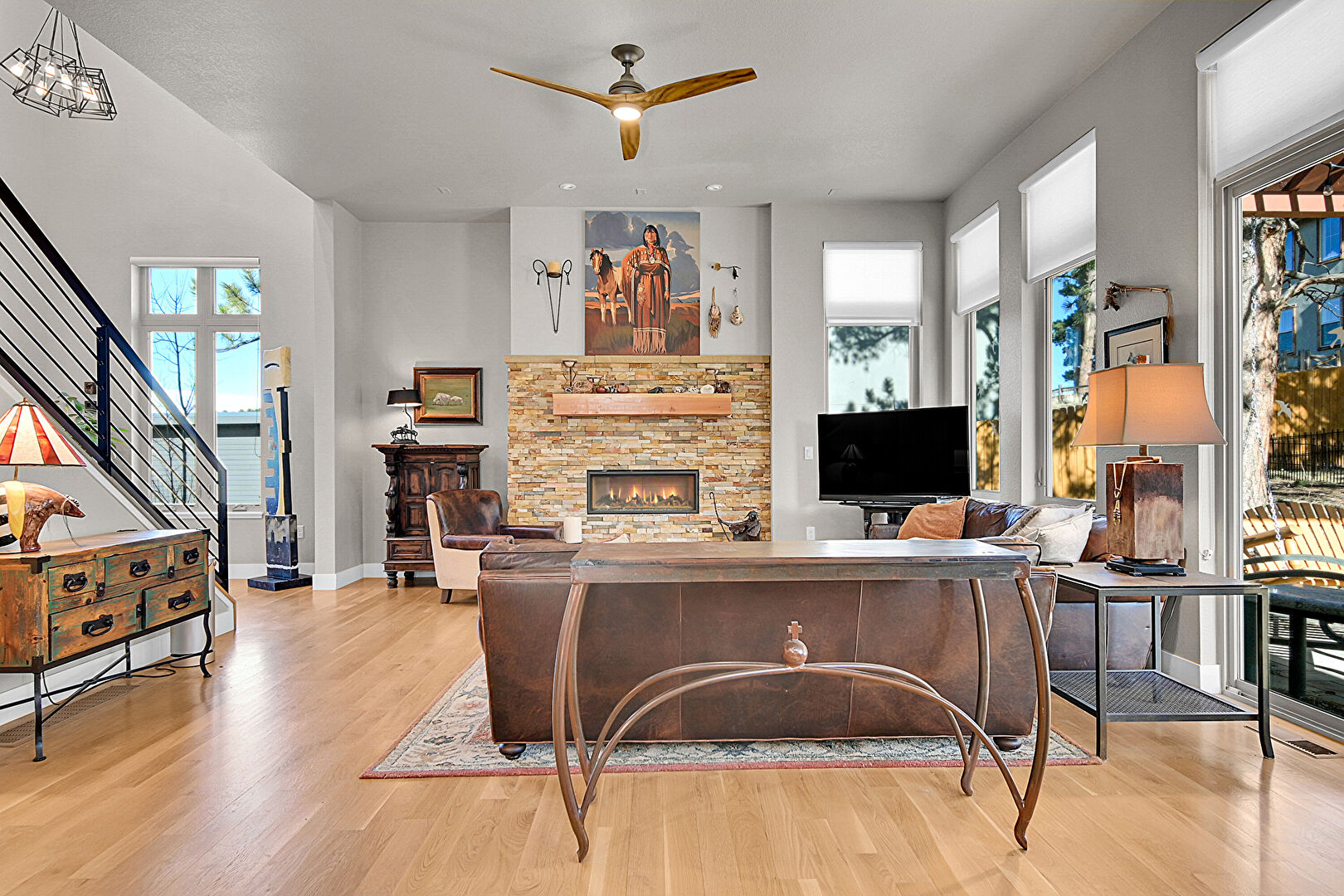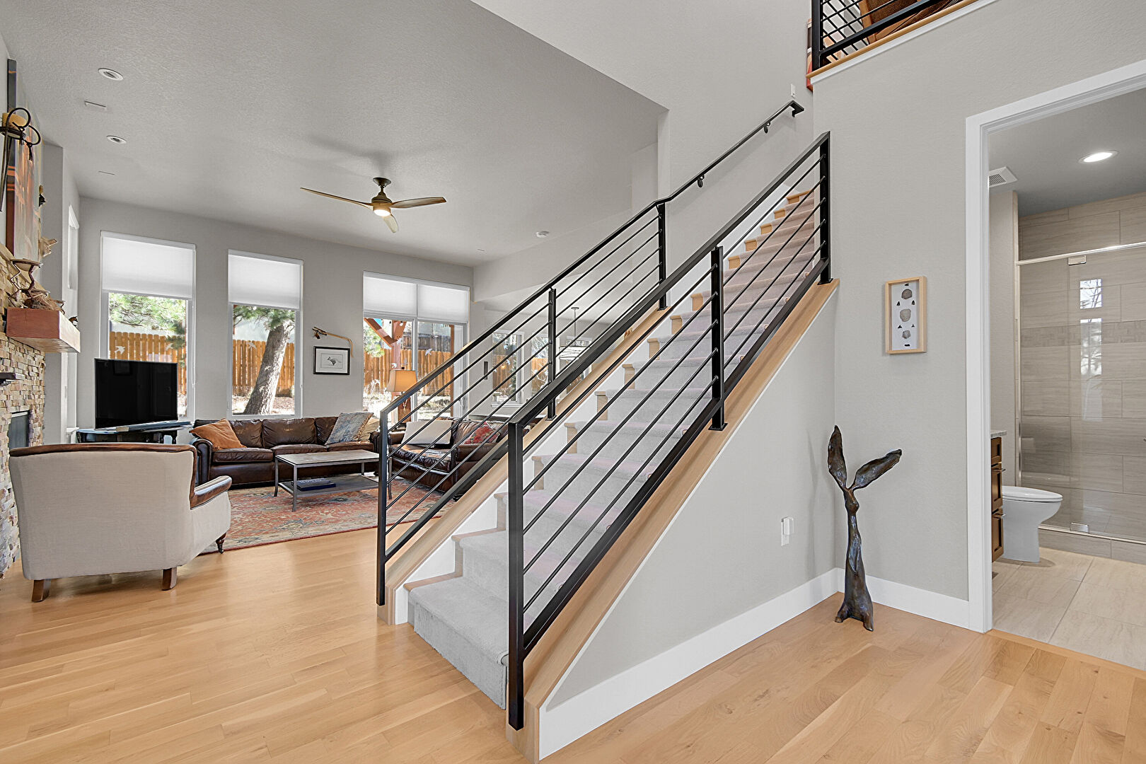 Baseboards Wall, Drywall, Fireplace, Natural Light, Recessed Lighting, Stairs, Wood Finish Floor, Ceiling Fan
