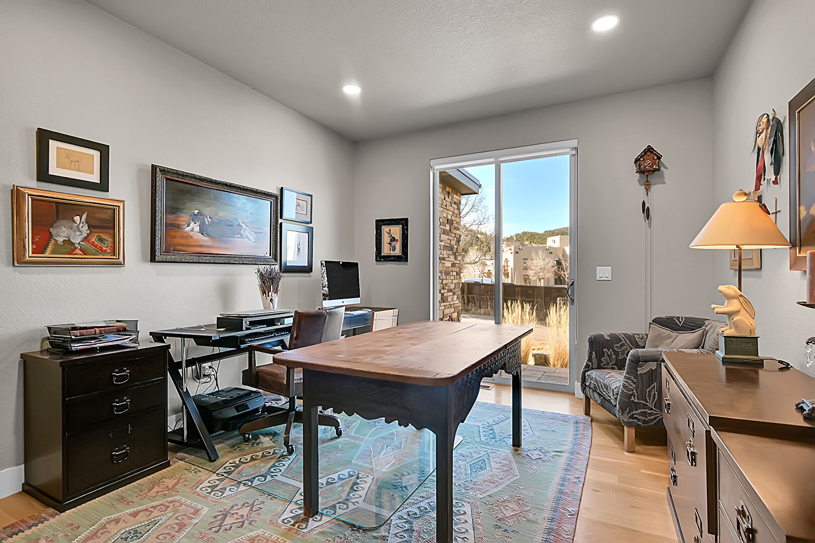 Access To Exterior, Baseboards Wall, Carpet, Ceiling Fan, Drywall, Natural Light, Office Area, Recessed Lighting, Smoke Carbon Monoxide Detector, Vent, Ceiling Fan, Drywall, Natural Light, Recessed Lighting, Wood Finish Floor