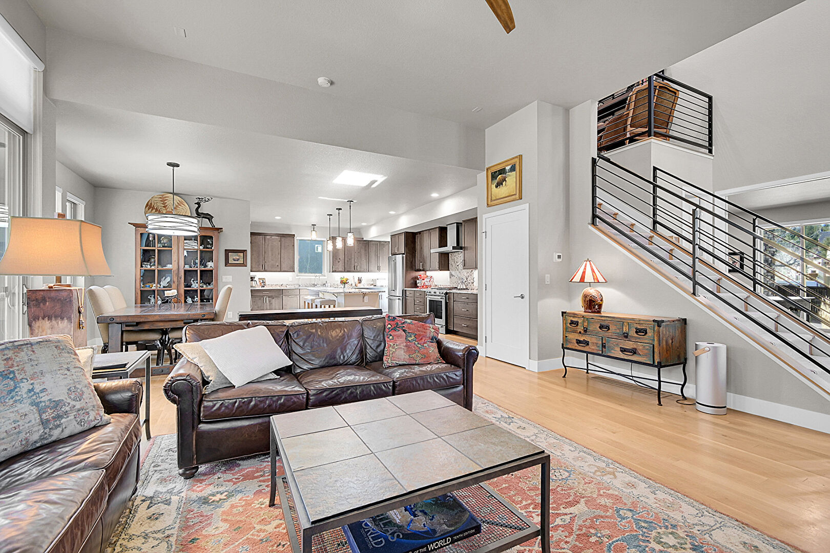 Baseboards Wall, Ceiling Fan, Drywall, Fireplace, Natural Light, Recessed Lighting, Stairs, Wood Finish Floor, Drywall, L Shaped Kitchen, Natural Light