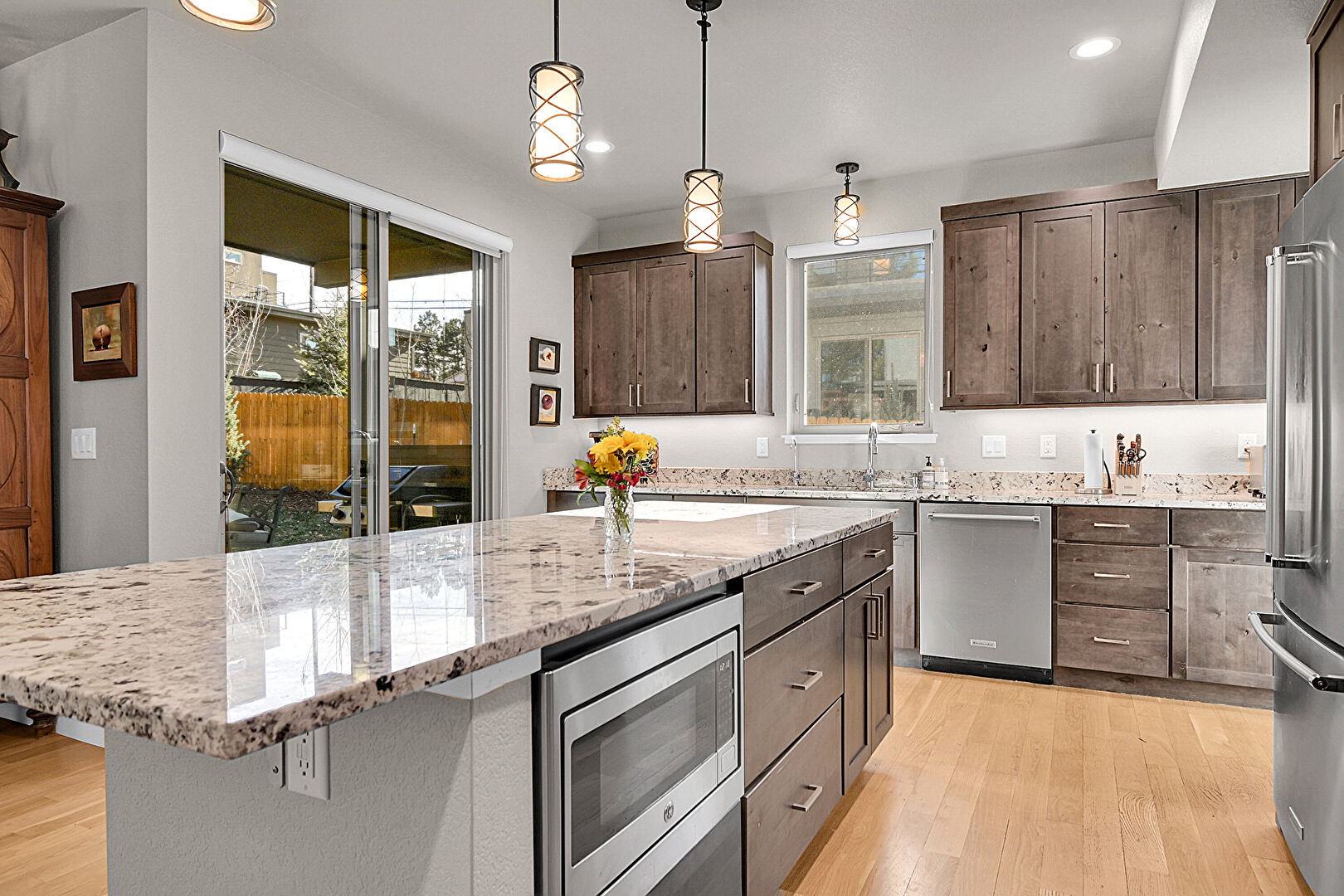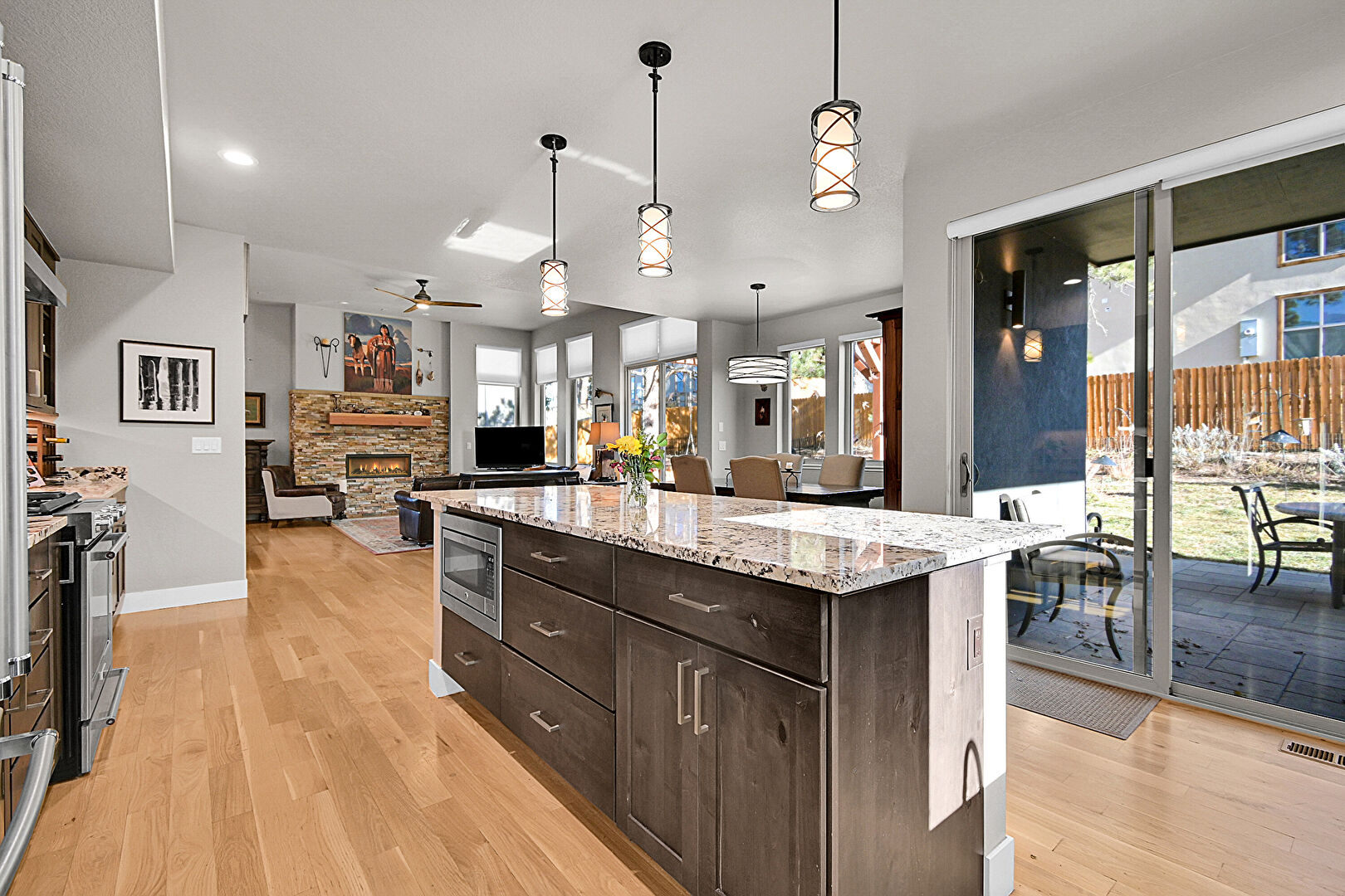 Baseboards Wall, Ceiling Fan, Dark Brown Cabinets, Drywall, Fireplace, Kitchen Bar, Kitchen Island, L Shaped Kitchen, Natural Light, Opens To Living Area, Pendant Lighting, Recessed Lighting, Shaker Cabinets, Stone Countertops, Vent, Wood Finish Floor, Kitchen Bar, Open Shelves, Wood Finish Floor