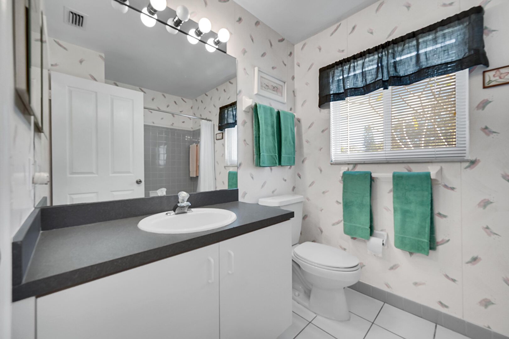Baseboards Wall, Combined Bath Shower, Full Bathroom, Natural Light, Tile Floor, Vanity, Wallpaper Wall, Vent, Wallpaper Wall