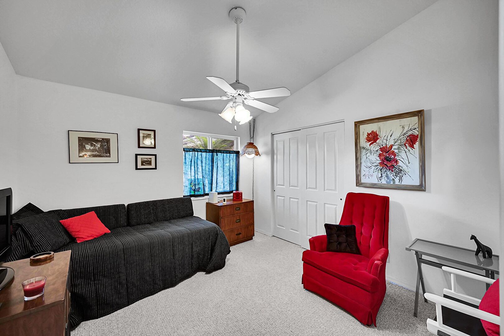 Carpet, Ceiling Fan, Closet, Drywall, Natural Light, Vaulted Ceiling, Vent, High Ceiling, Vaulted Ceiling