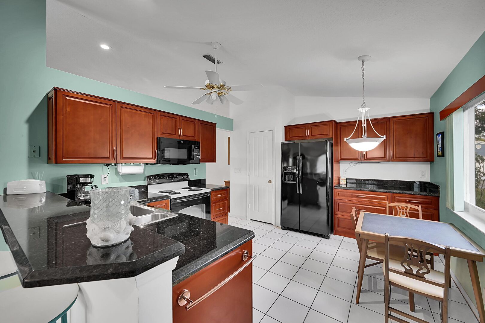 Ceiling Fan, Drywall, G Shaped Kitchen, Recessed Lighting, Tile Floor, Vaulted Ceiling, Vent, Natural Light, Tile Floor