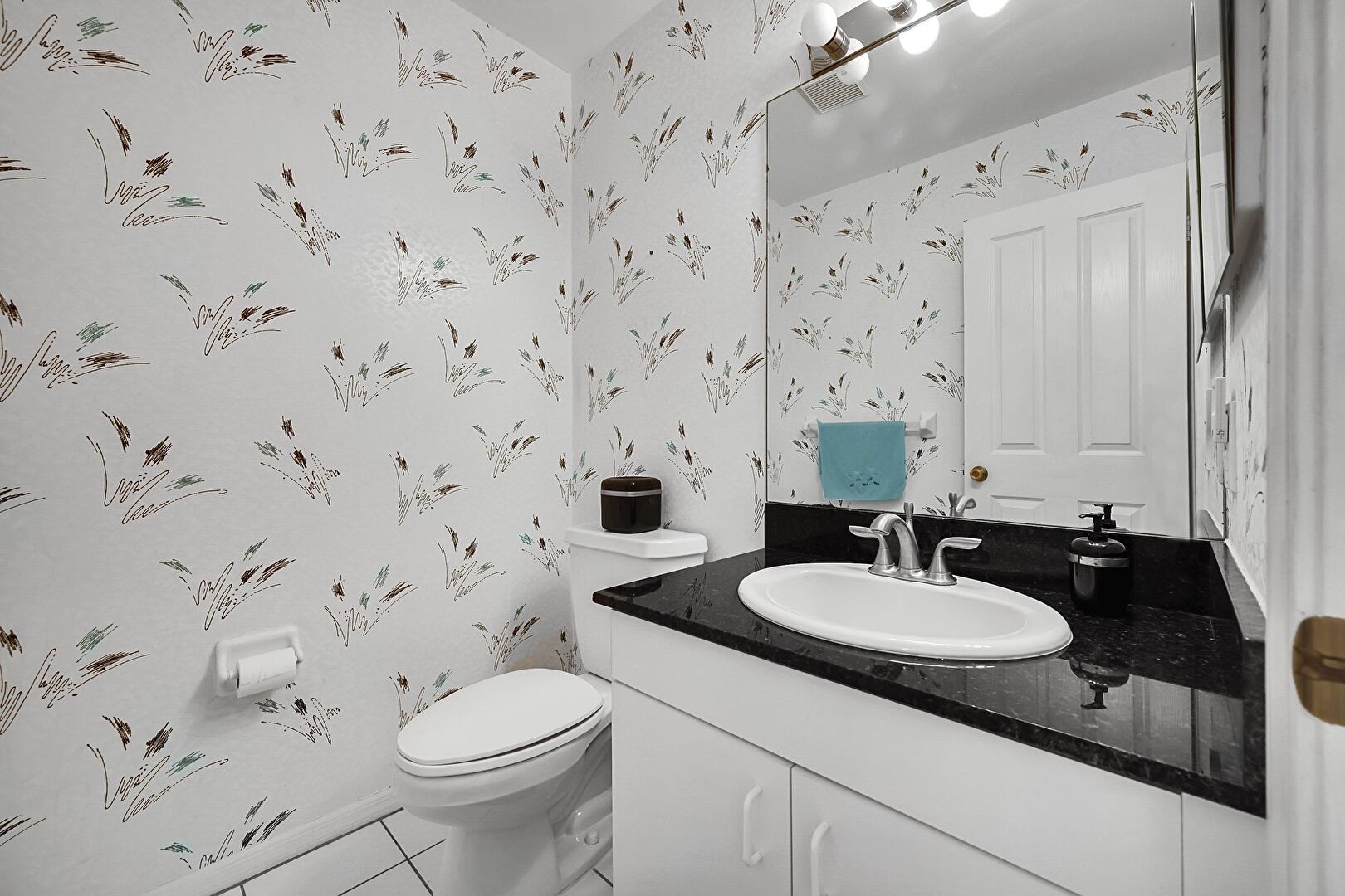 Half Bathroom, Tile Floor, Vanity, Vent, Wallpaper Wall