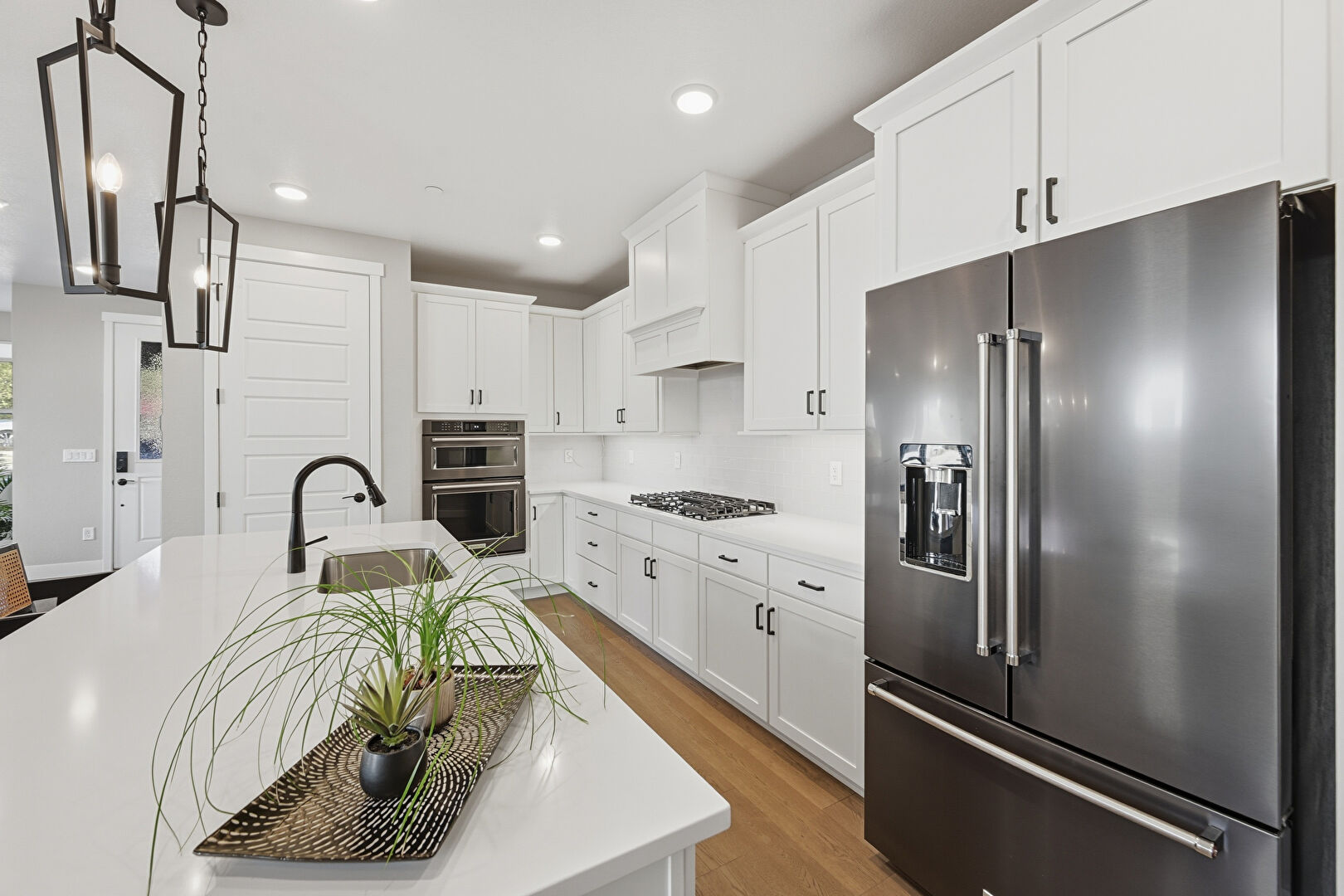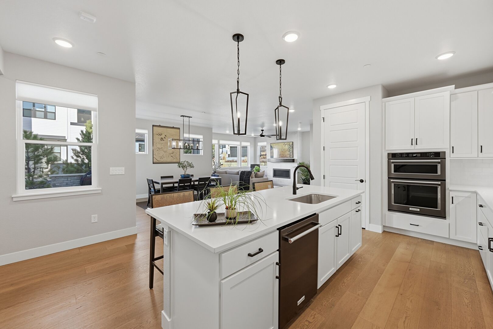 Baseboards Wall, Crown Molding Cabinets, Double Oven, Drywall, Kitchen Bar, Kitchen Island, L Shaped Kitchen, Natural Light, Notable Chandelier, Opens To Living Area, Pendant Lighting, Recessed Lighting, Shaker Cabinets, Stone Countertops, Wood Finish Floor, Baseboards Wall, Drywall, Shaker Cabinets, Stone Countertops