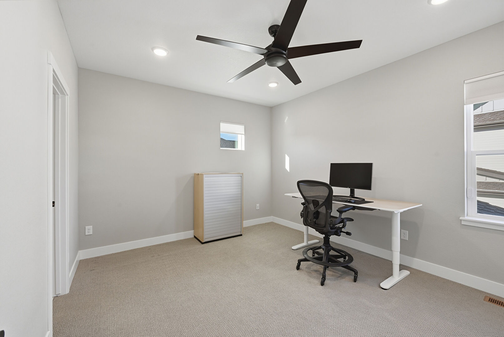 Baseboards Wall, Carpet, Ceiling Fan, Drywall, Natural Light, Office Area, Recessed Lighting, Vent, Carpet, Drywall