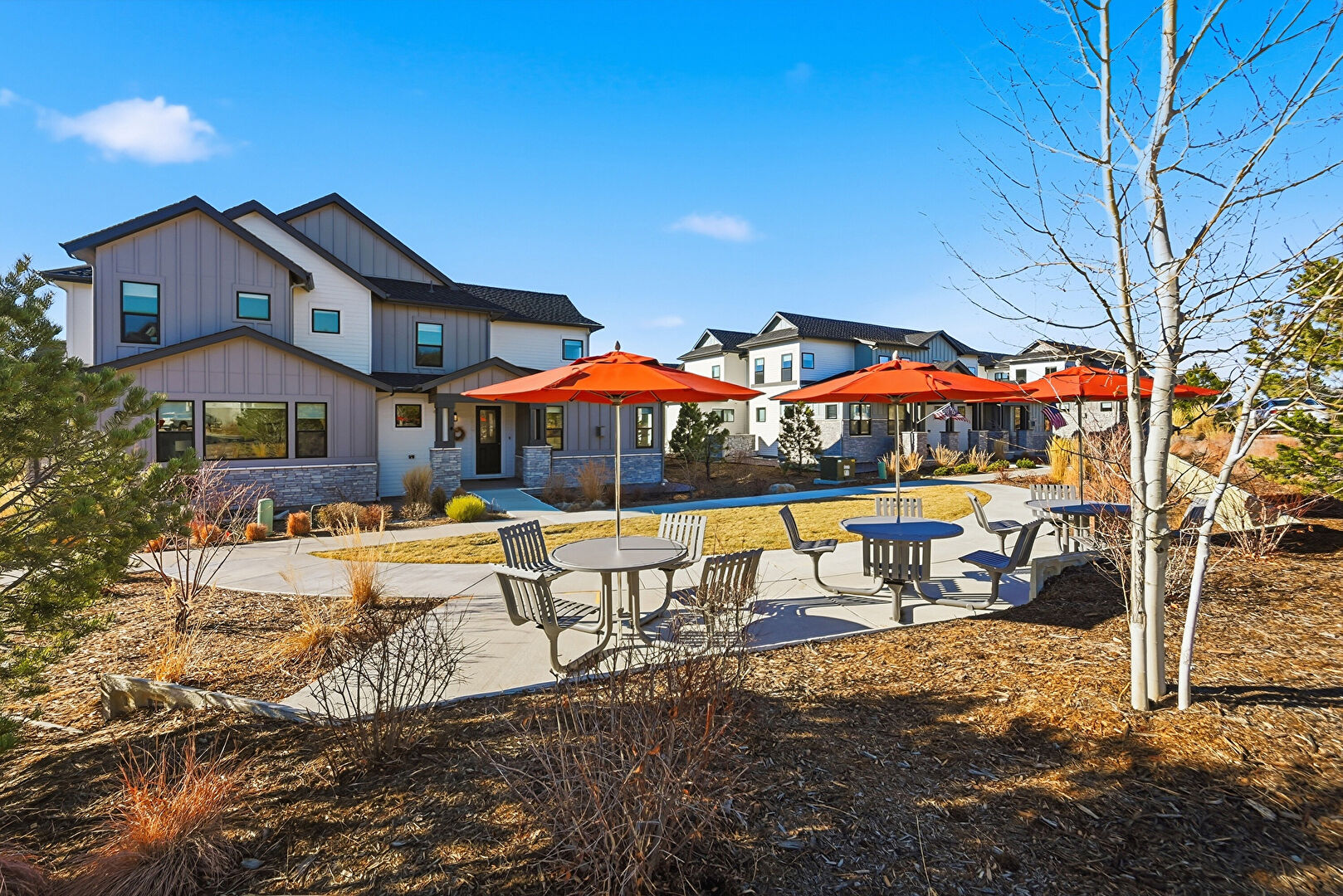 Board Batten Siding, Downspout, Gutters, Horizontal Siding, Lawn, Outdoor Dining Area, Patio, Porch, Residential View, Stone Siding, Vertical Siding, Board Batten Siding, Gutters, Porch, Vertical Siding