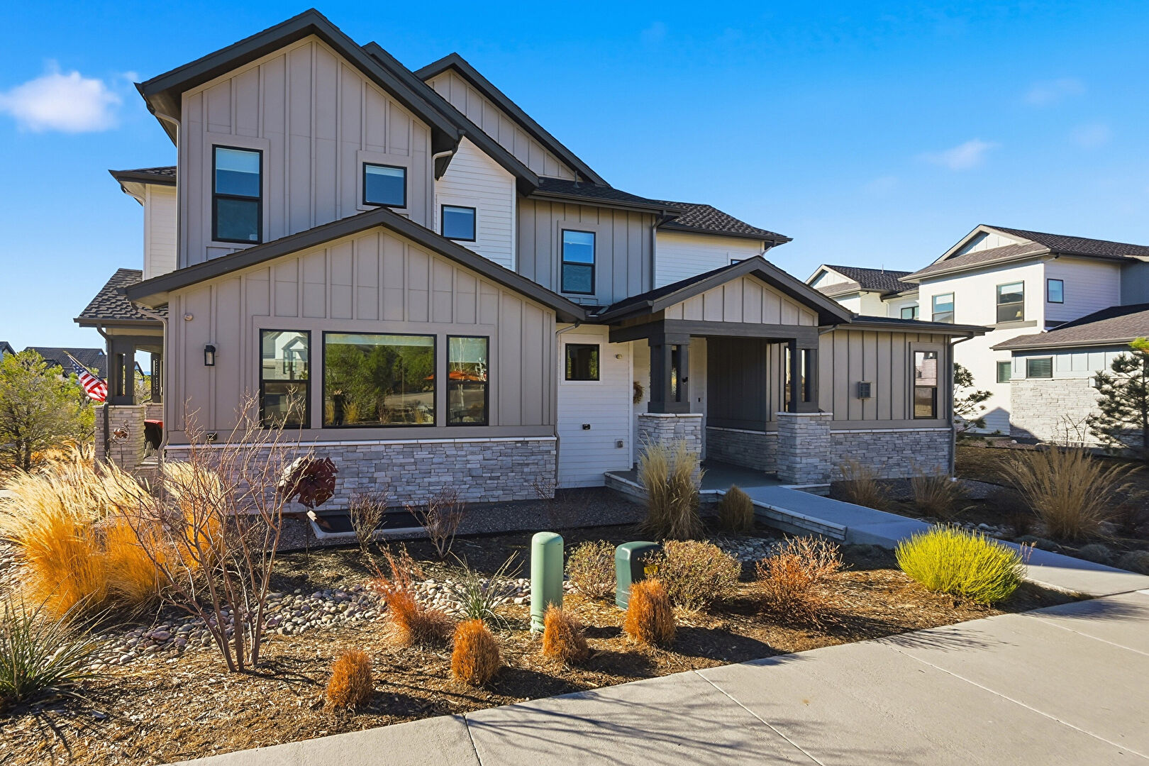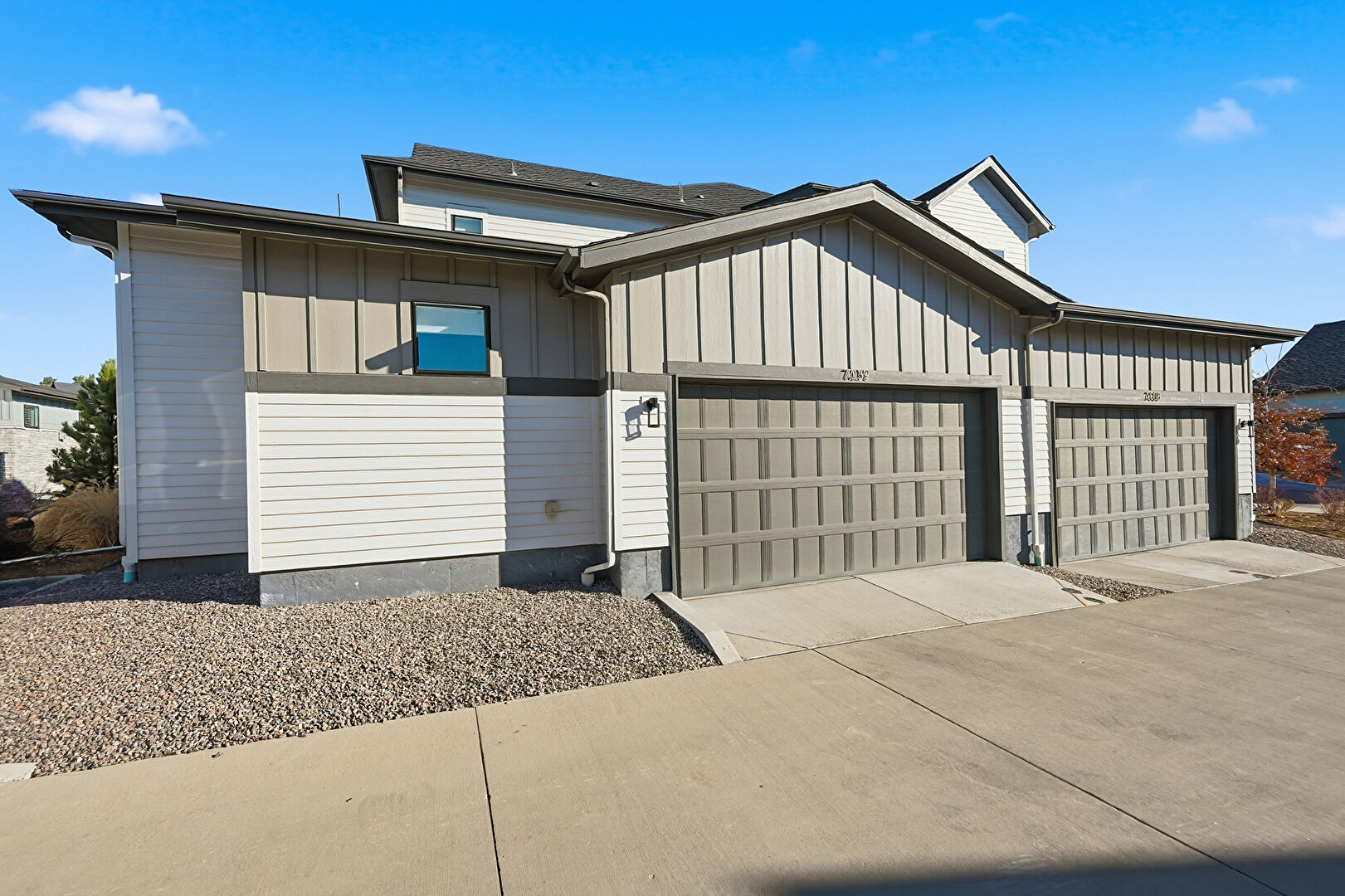 Board Batten Siding, Concrete Foundation, Dormer Roof, Downspout, Driveway, Horizontal Siding, Vertical Siding, Gutters